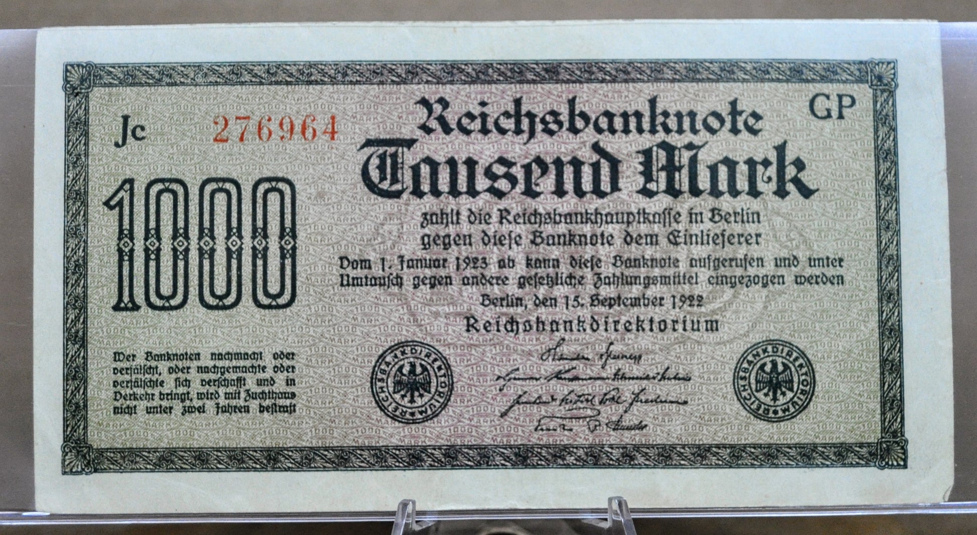 1922 Germany 1000 Mark Banknote - Reichsbanknote - Wavy Lines Watermark - 1922 One Thousand Mark Note - P#76g