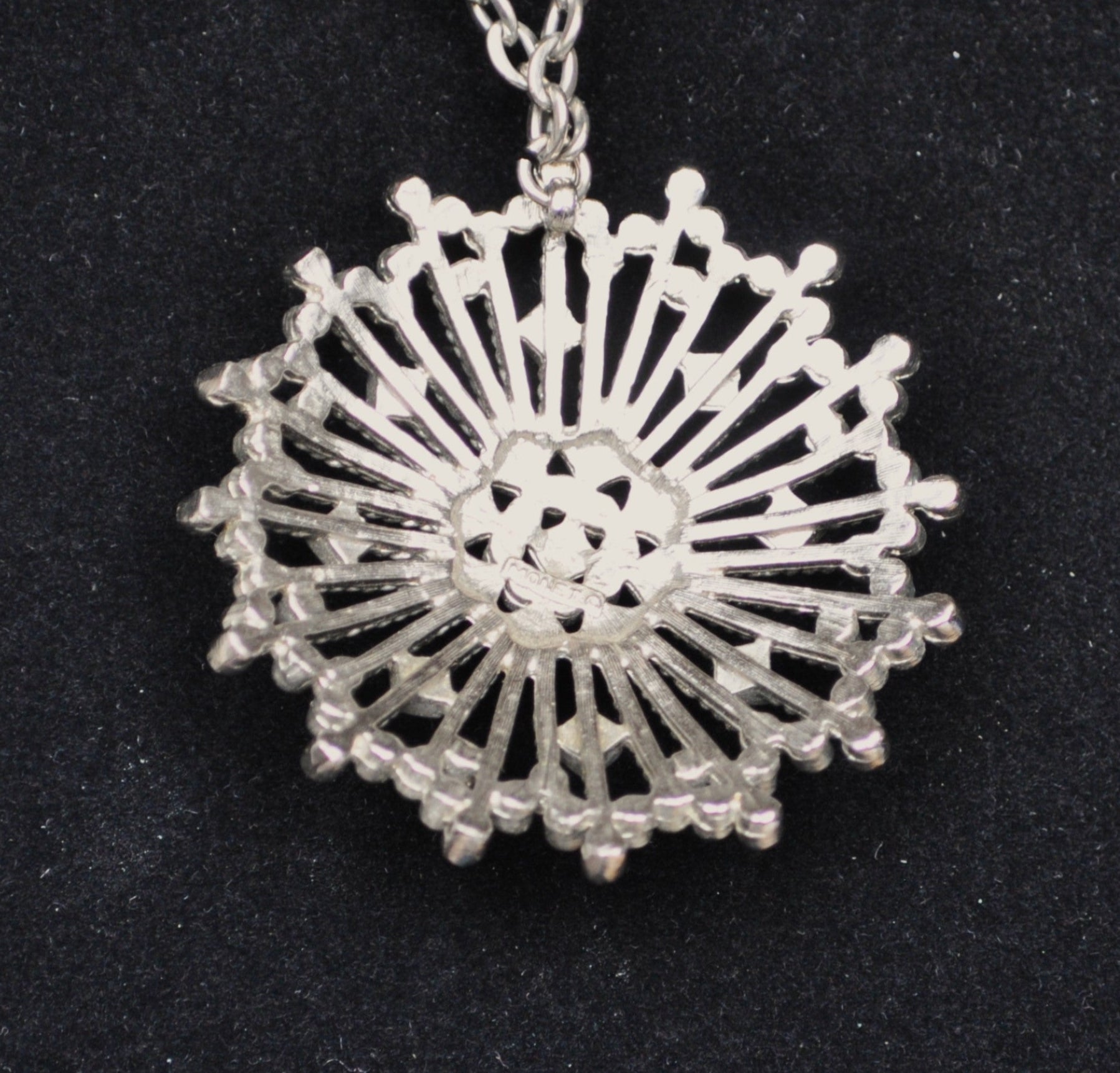This listing is for the photographed Vintage Monet Signed Silvertone Atomic Starburst Statement Pendant Necklace. Necklace chain measures 24 inches, pendant measures 2 inches. Signed "Monet" the reverse side of the pendant, as pictured. Stunning silver starburst designed pendant! Amazing piece from a great company! Perfect statement piece for any collection!