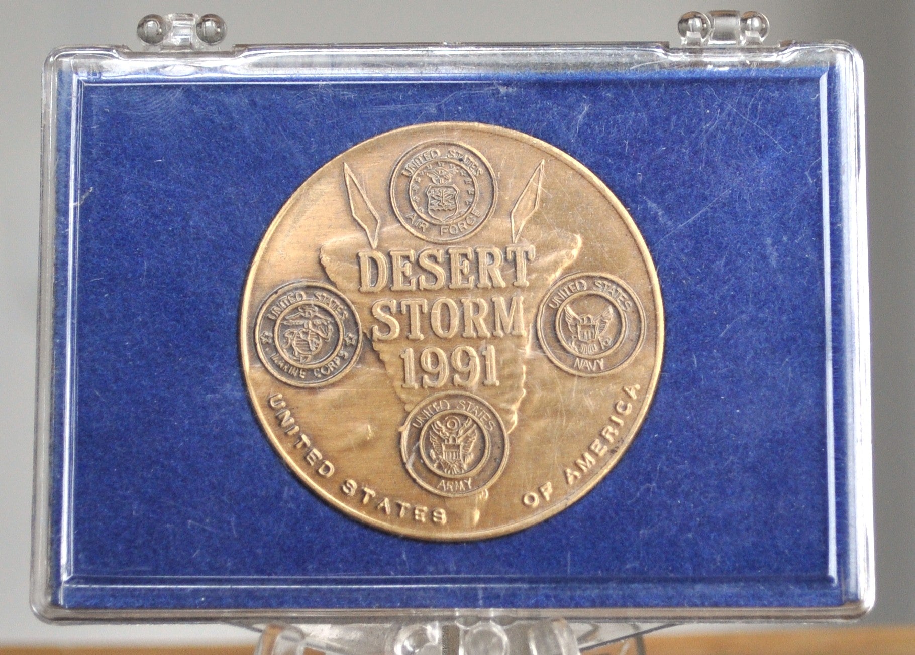 This listing is for the 1991 Desert Storm United States of America Coin. This token was issued to people who served in the Persian Gulf War in the Air Force, Army, Navy, and Marine Corps. It was thanking the brave men and women soldiers for their service. This is in the original case that was given to the soldiers. Great Find!