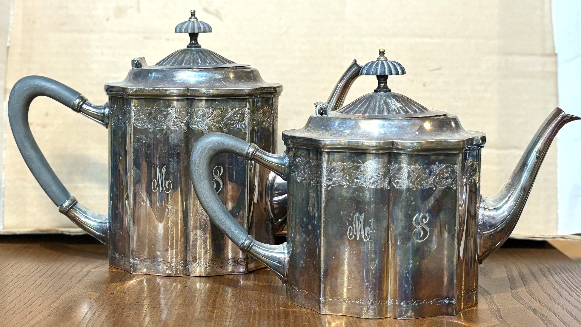 Vintage Teapot by E.G. Webster & Son, Custom-engraved Set of Two- E.G. Webster Silver Plated Antique Teapot 2pc Set
