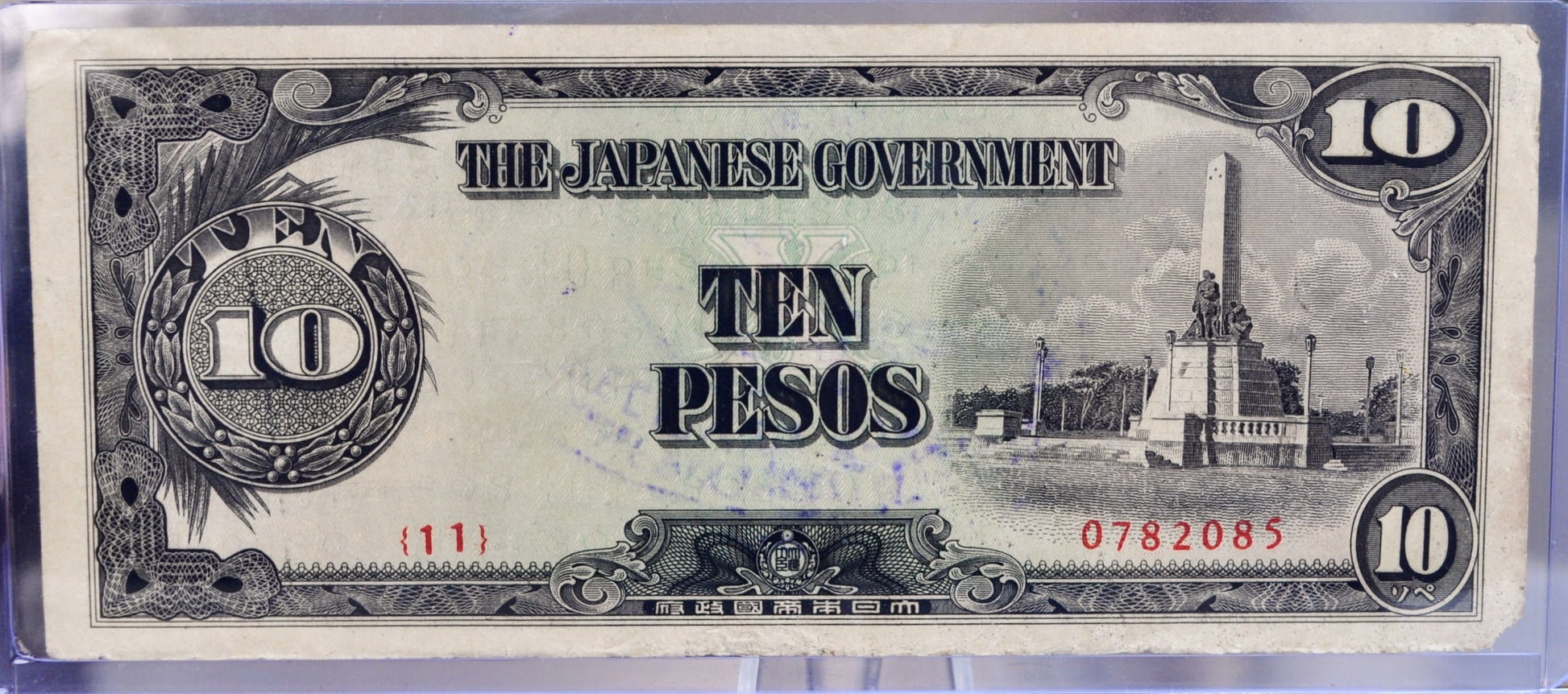 1943 Philippines Japanese Government 10 Peso Note - WW2 Japan Occupation - JAPWANCAP Stamped - 1943 Filipino Ten Pesos Stamped Note - P#111a