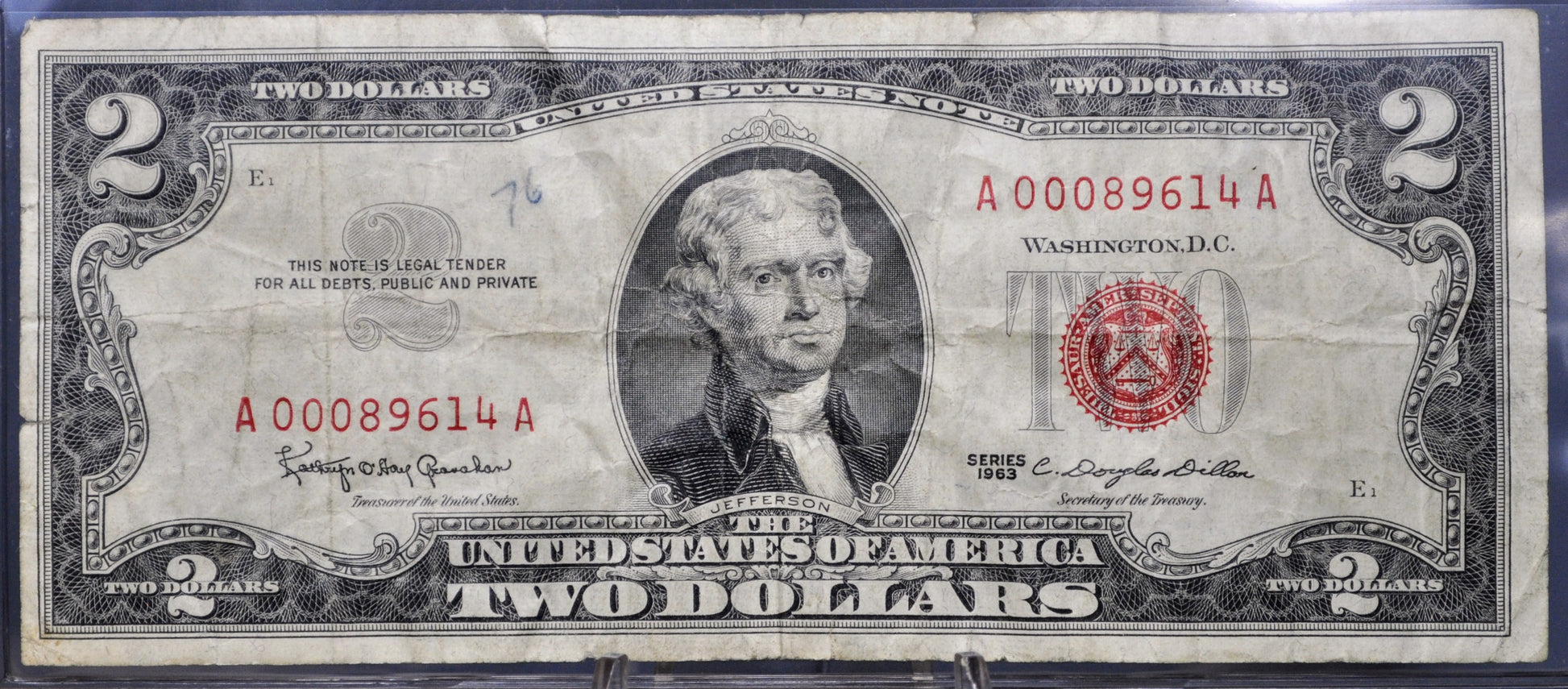 1963 Low Serial Number U.S. Legal Tender 2 Dollar Note - 00089614 - 1963 Two Dollar Low Serial Red Seal Note - Fr#1513