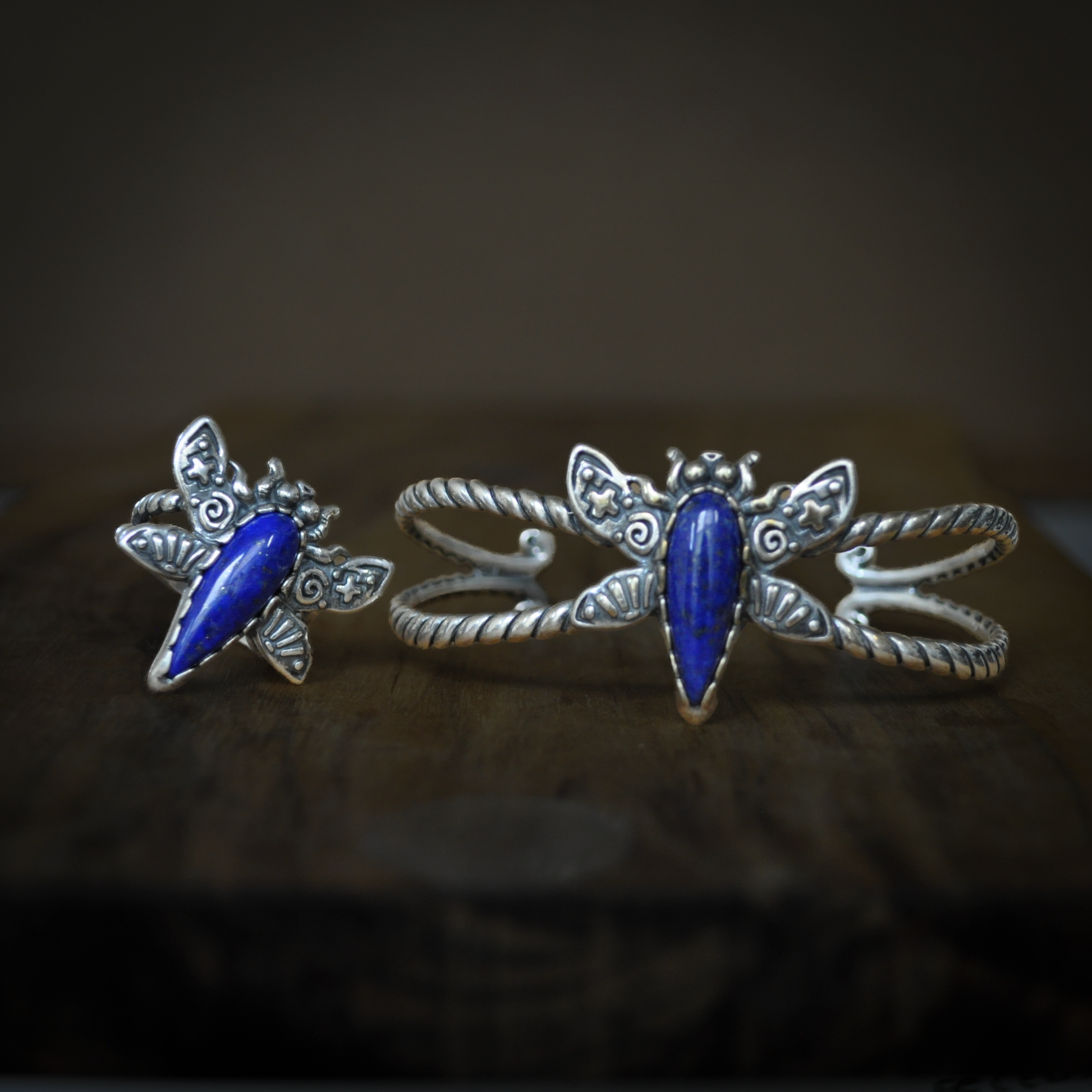 This listing is for the Carolyn Pollack American West Sterling Silver Blue Lapis lazuli Dragonfly Ring & Cuff Bracelet Set. Both pieces feature a dragonfly centerpiece with detailed oxidized scrollwork and flower engravings on the wings to create a vintage look. The gemstones are securely held in beaded bezels, adding texture to the frame. The gemstone featured in both pieces is Blue Lapis. This stone's two-part name comes from two different cultures: lapis is a Latin word meaning "stone," while lazuli comes from the Persian word lazhuward, meaning "blue." It is not an element nor a mineral it is a rock containing multiple minerals: lazurite, diopside, calcite, pyrite, and more. Beautiful Find!!!