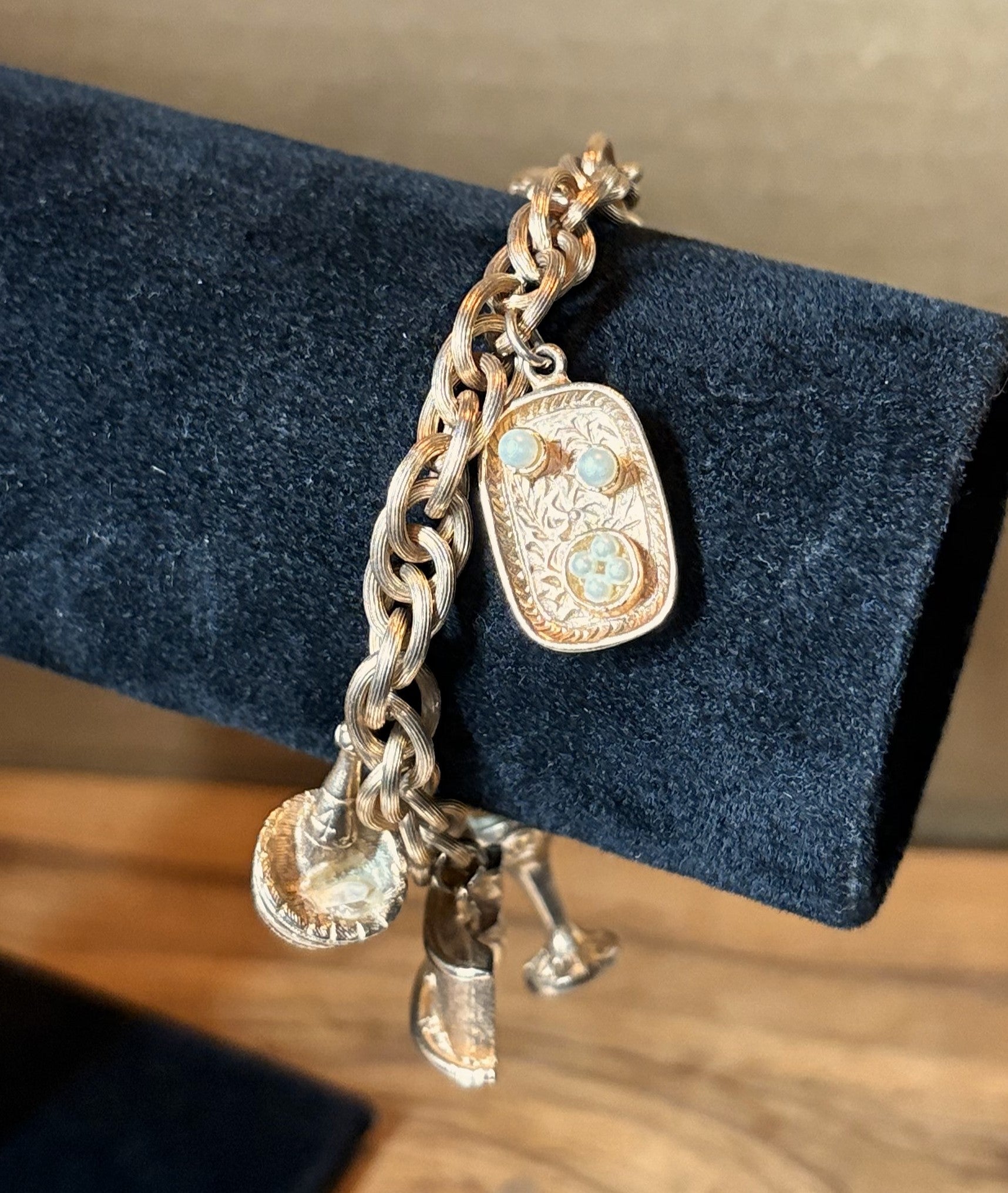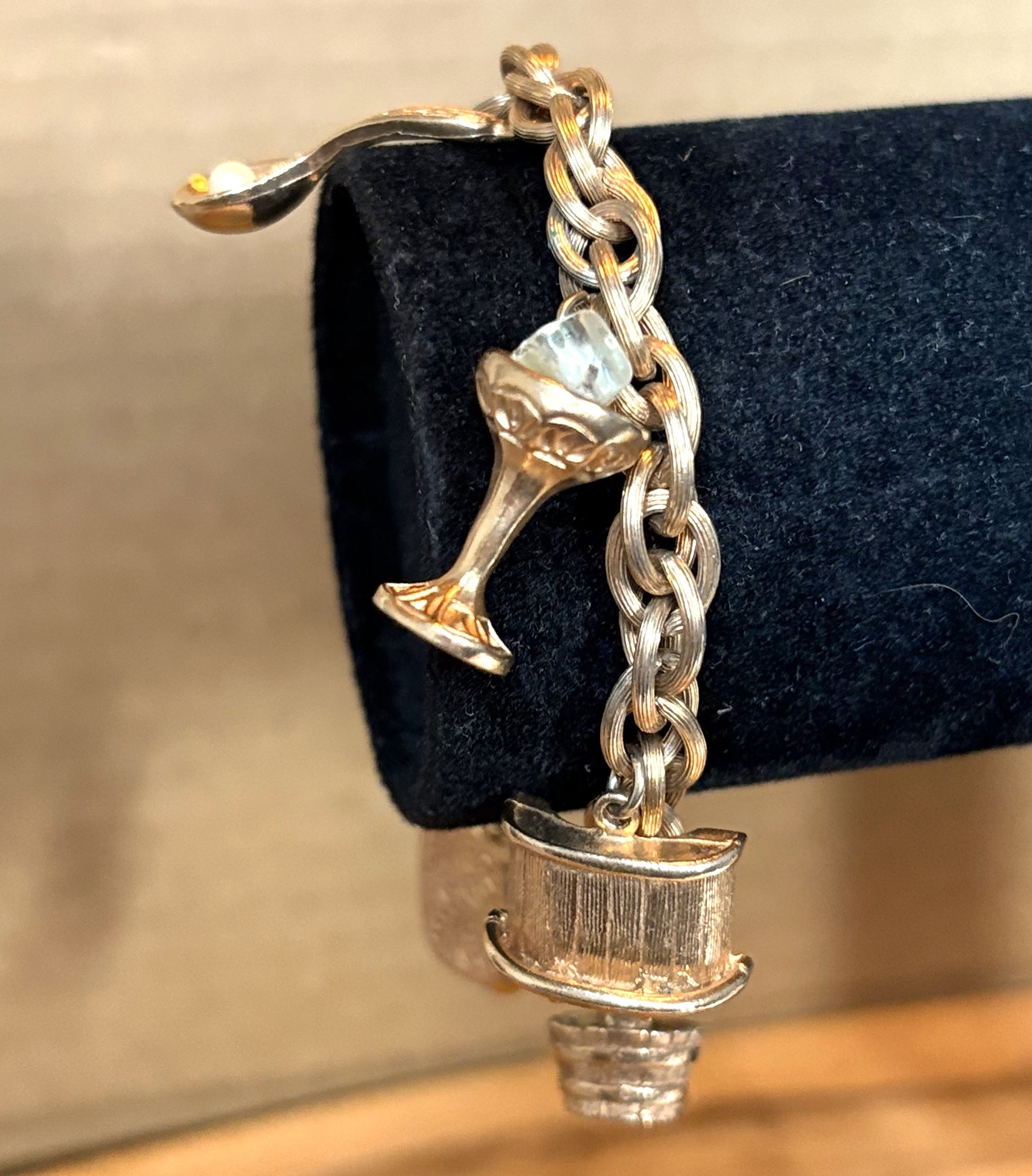 This listing is for a Vintage 1950s "Happy Hour" Copper Charm Bracelet Barware Theme. This is a pristine tribute to 1950s cocktail culture. The curated collection of six solid-cast charms begins with a detailed 3D cobbler-style cocktail shaker and a classic champagne ice bucket, the icons of any vintage bar set. The mixology theme continues with a tall-handled mixing pitcher and a delicate, long-handled bar spoon, modeled after professional stirring tools. Rounding out the set is a wooden bar with drinks underneath. Secured by a classic vintage "donut" spring-ring clasp, this collector-grade piece is in mint condition, making it a standout accessory for any bartender, mixologist, or lover of mid-century kitsch. Great Find!!!