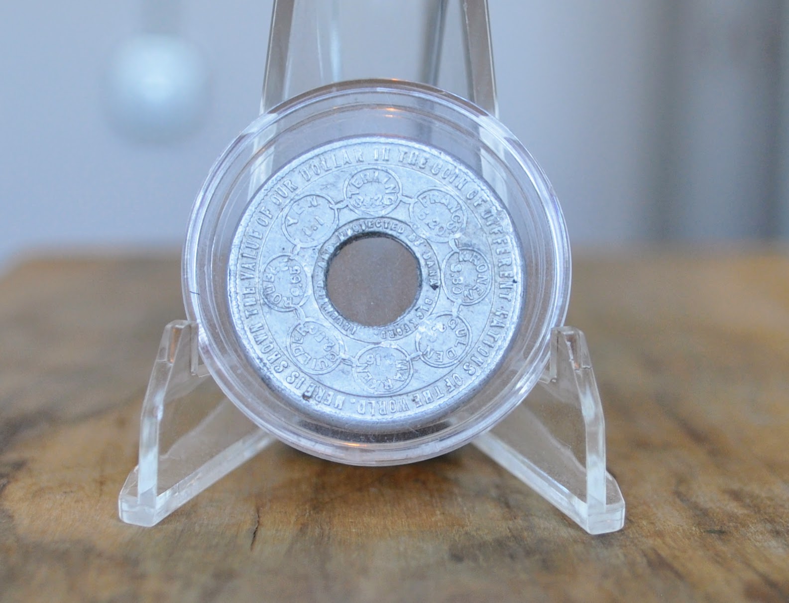 This listing is for a 1987 Bickford Bi-metal So-called Dollar by Dana Bickford. It does NOT contain the brass centerpiece. Dana Bickford traveled to Europe and, upon arrival to sell a recent invention he, had difficulties exchanging dollars for foreign currency. This sparked the creation of the Bickford Dollar Collections. This is the HK-833 Variate, aluminum coin missing the brass center. Great Find!