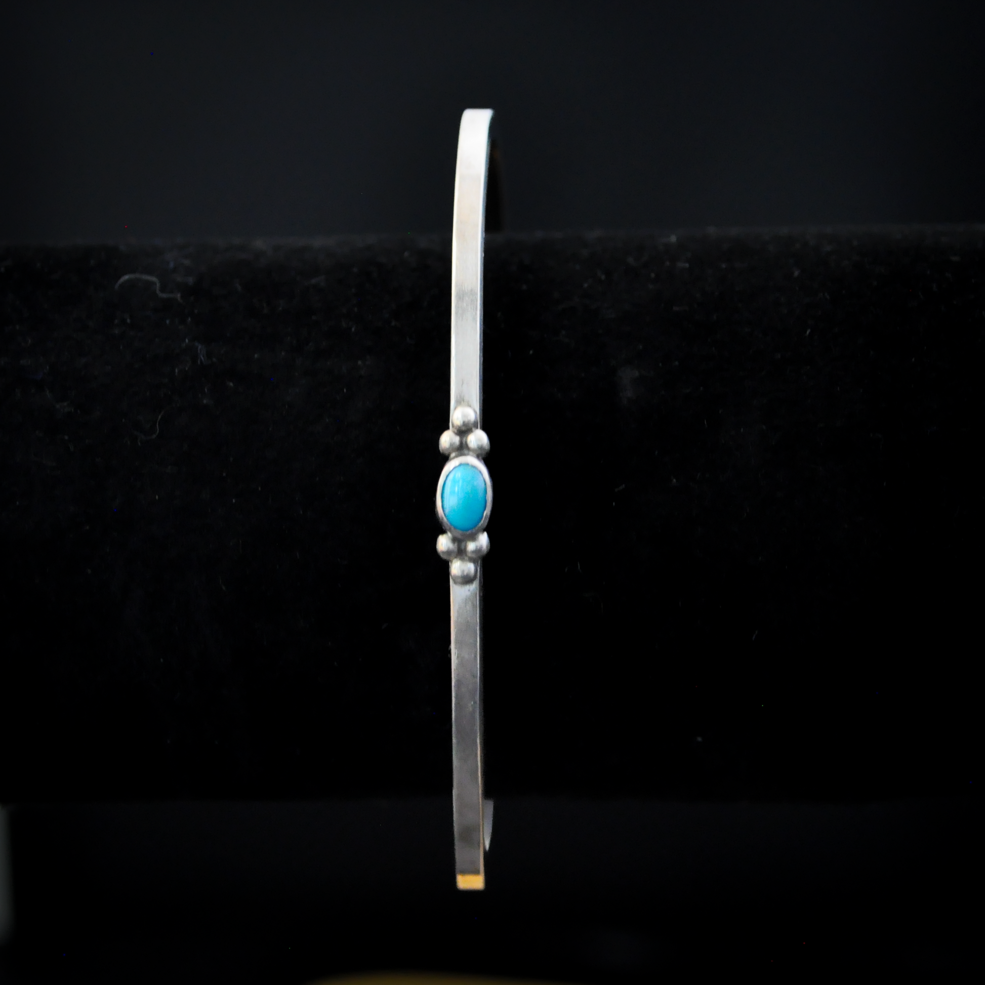 This listing is for the photographed Sterling Silver Sleeping Beauty Turquoise Cabochon Cuff Bracelet - 5 in Wrist. Beautiful sterling silver bracelet featuring a sleeping beauty turquoise cabochon with beaded details. Stamped on the inside of the bracelet is "Sterling". The Navajo believed turquoise was a sacred stone used for protection from evil, good fortune, and health. The turquoise blue is very special in Navajo culture resembling the sky and water. Beautifully designed bracelet that reflects Naive American spirituality and design!