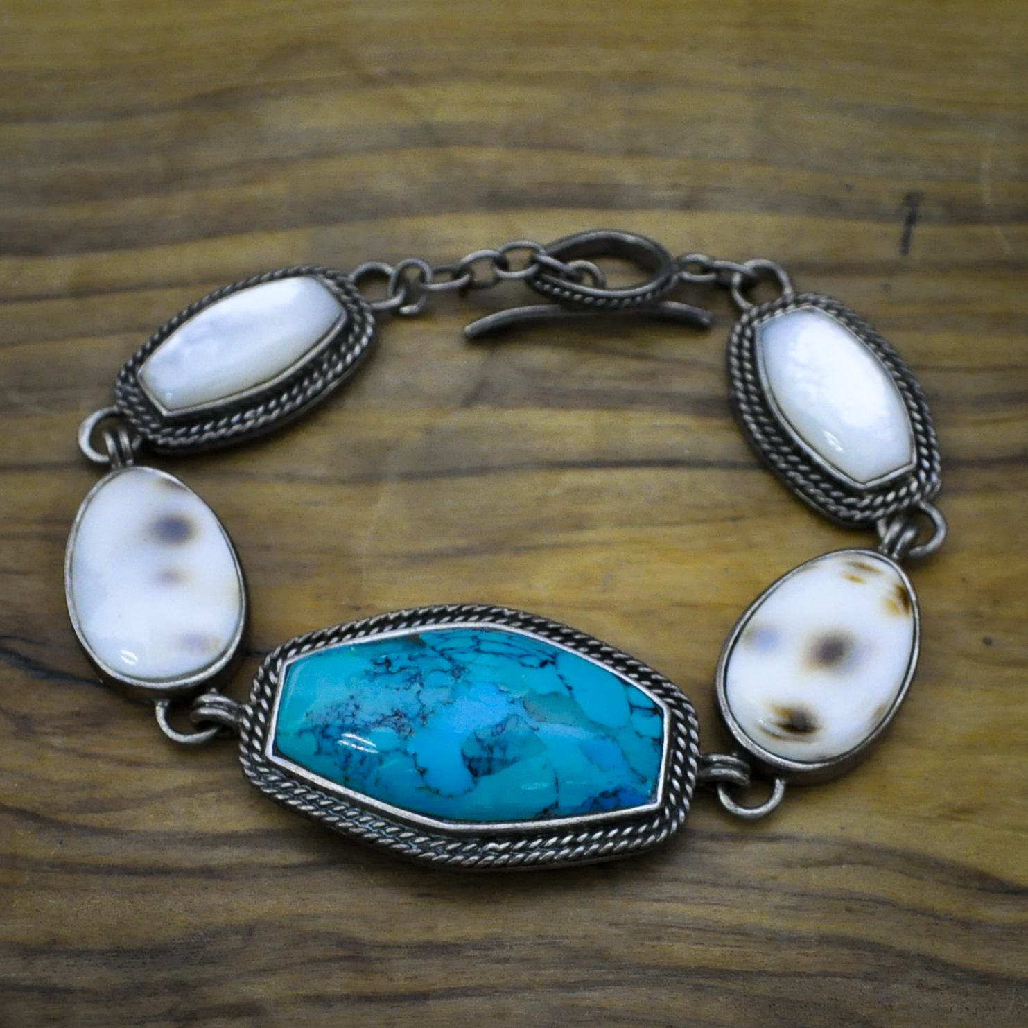 Barse Brand Multistone Sterling Silver Bracelet, Turquoise, Cowry Shell, and Mother-of-Pearl - Sterling Silver Link Bracelet Featuring Natural Turquoise, Tiger Cowry Shell, and Mother-of-Pearl Accents