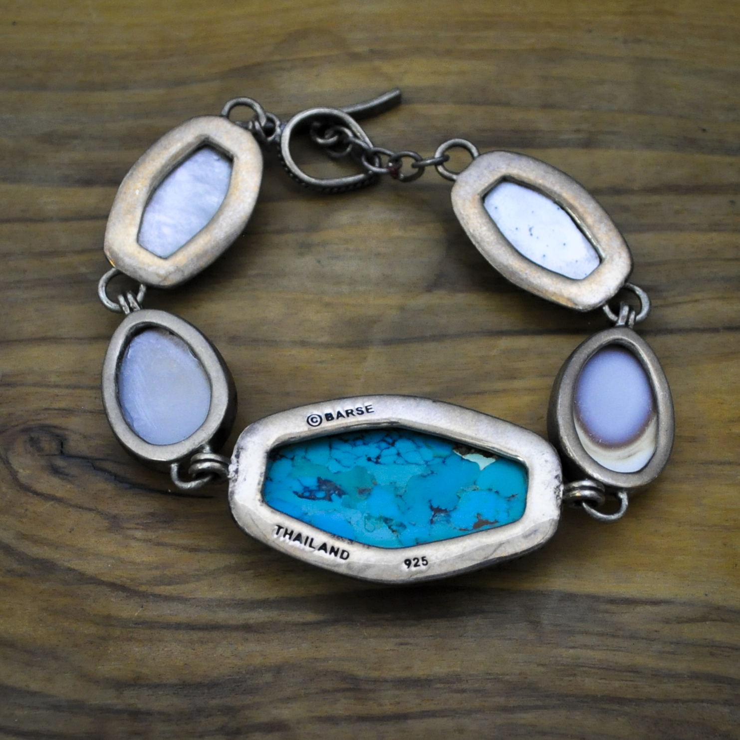 This listing is for the Barse Brand Multistone Sterling Silver Bracelet, Turquoise, Cowry Shell, and Mother-of-Pearl. Barse Jewelry is a Dallas-based, specialized design house founded in 1986 by Melanie Barse and Michael Gobril, known for handcrafted, artisan-style jewelry featuring genuine, colorful stones. This brand is a stunning Multistone link bracelet crafted from high-quality 925 sterling and centered by a large, hexagonal Natural Turquoise cabochon with distinct matrix patterns. Flanking the center are two oval Tiger Cowry Shells with natural brown-and-white spotted markings, followed by two iridescent white Mother-of-Pearl end stones. Beautiful Find!!