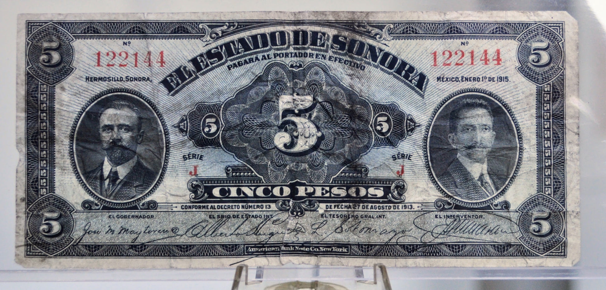 In the State of Sonora (El Estado de Sonora), started the revolution circulating banknotes issued by the State of Chihuahua, which were first established by Madero in 1911. It wasn't until 1915, due to the popular practice of counterfeiting Chihuahua banknotes within the region, that the local government of Sonora decreed that they would issue their own banknotes. After this point, until the end of the Mexican Revolution period, the state would issue their own paper banknotes for circulation within their local economy.
