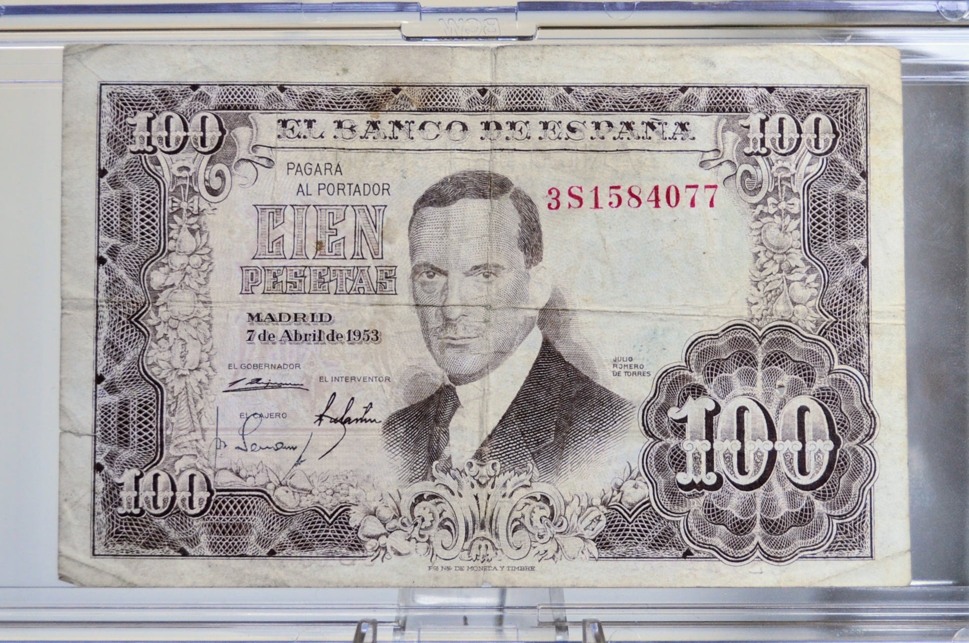 This listing is for the photographed 1953 Banco de Espana 100 Pesetas Banknote. Issued on April 7th, 1953, in Madrid by the Bank of Spain. Obverse of this note depicts a portrait of the painter Juan Romero de Torres at the center. The reverse side of this note shows a painting of a woman done by Torres at the center. Very Fine (VF) grade/condition, some visible folds and other signs of circulation, as pictured. Great piece of history and an excellent addition to any collection! P#145a (Pick Number 145a).