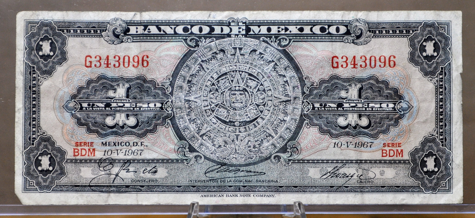 Bank of Mexico 1 Peso Bank Note - Aztec Calendar Design - Choose by Year - Banco de Mexico One Peso Aztec Calander Note - 1948-1965