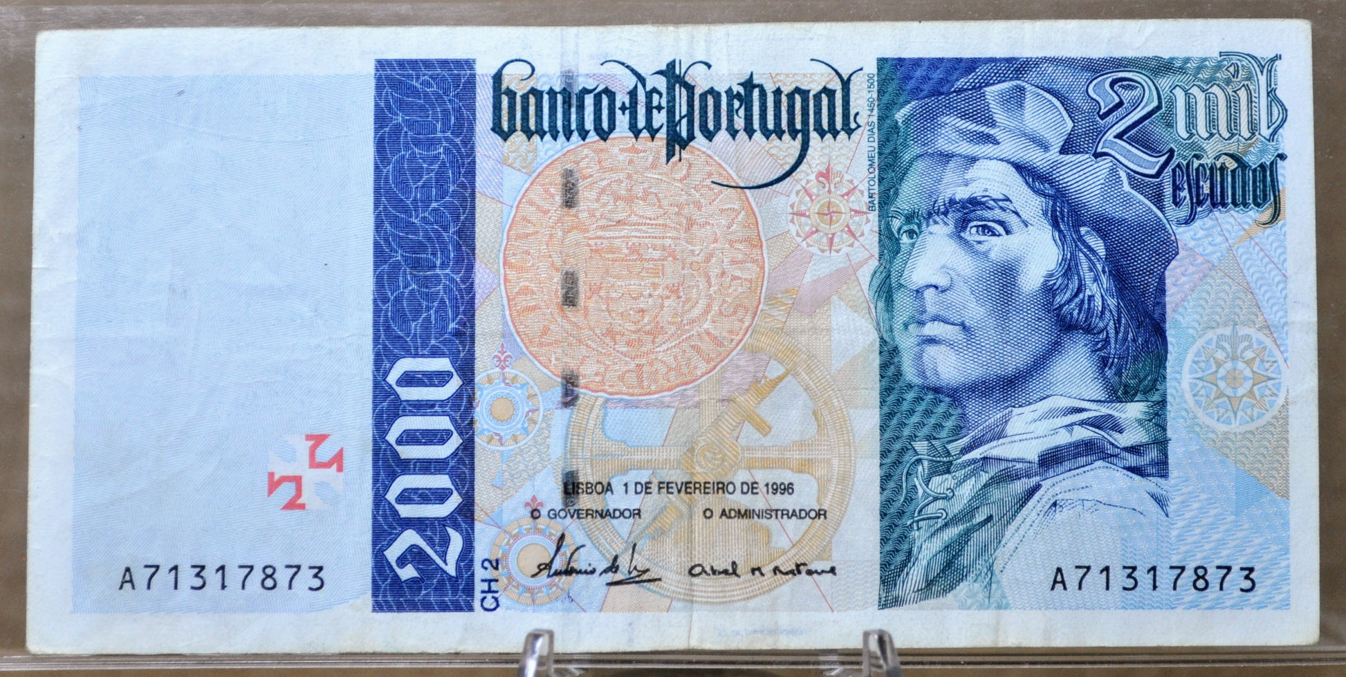 This listing is for the photographed 1996 Banco de Portugal 2000 Escudos Bank Note. Issued on February 1st, 1996, in Lisbon, Portugal. The obverse of this note depicts a portrait of Bartholomeu Dias on the right end, a cruzado coin of Dom Joao II at the upper center, and a sailing instrument underprinted at the lower center. The reverse shows an old sailing ship at the center right and a compass and map at the center. Extremely Fine (XF) great/condition, minor signs of circulation, crisp note! Great piece of history and an excellent addition to any collection. P#189b (Pick Number 189b).