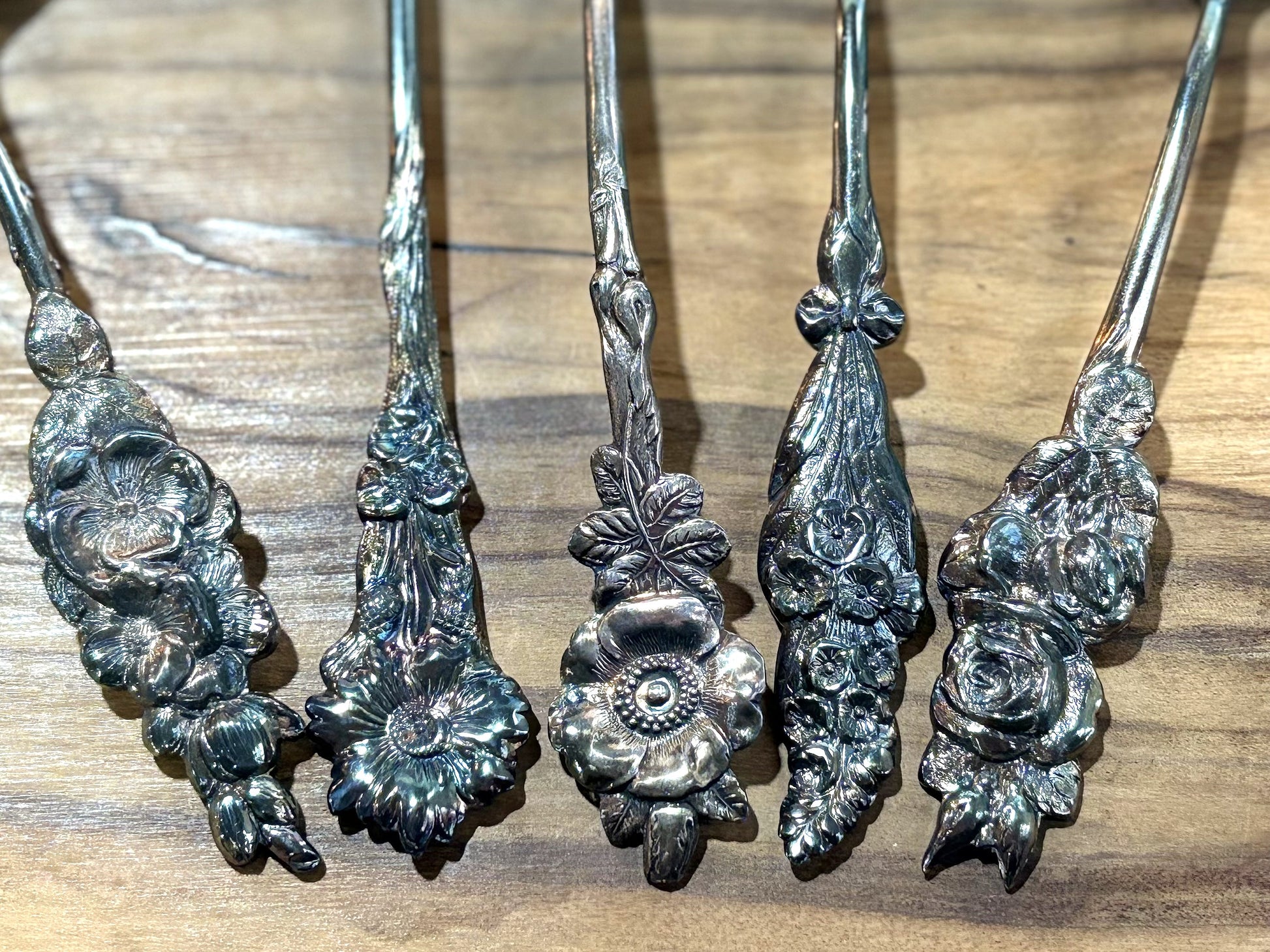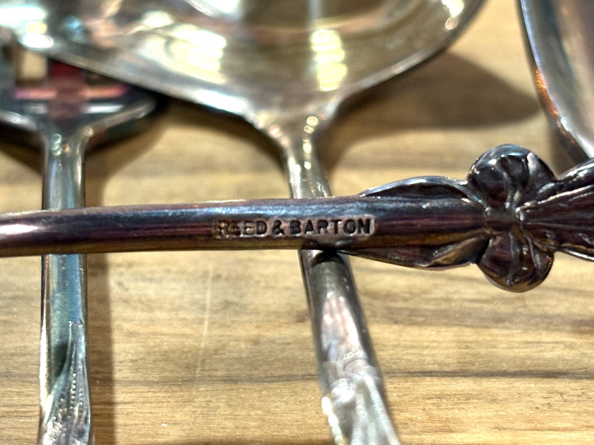 This listing is for Reed & Barton 5pc Hors d'Oeuvre Set, Formal Dining. This set includes one Bon-Bon Spoon, a small, deep spoon for serving candies or nuts. One Pickle Fork: A two-tined fork with a long handle, used for pickles or olives. One Sauce/Cream Ladle: A small ladle for serving sauces, gravies, or cream. One Lemon Fork: A two-tined fork, often with a slightly different shape from the pickle fork, for serving lemon slices. One Jelly Server: A small, flat, spade-shaped spoon for serving jelly or preserves. This set is unique because each piece in the set features a different decorative handle design. This is known as a "multi-motif" pattern.