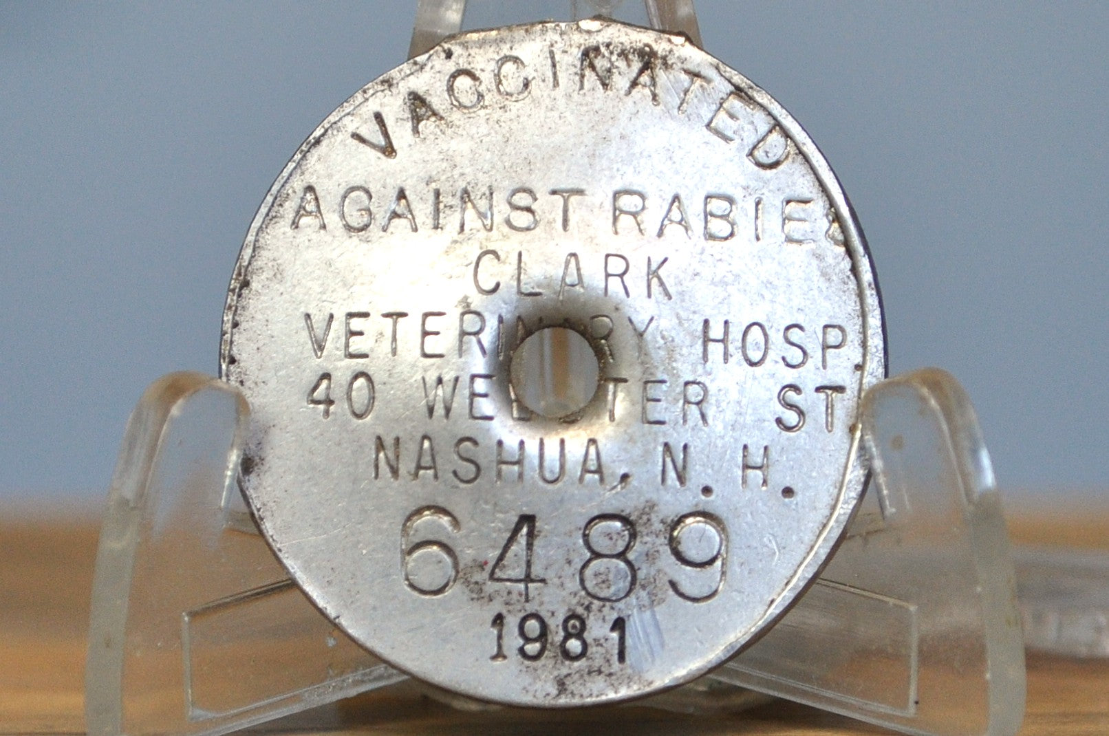 This listing is for the Nashua, New Hampshire, Vintage Rabies Vaccine Tag. This is a vintage rabies vaccination tag issued by the Clark Veterinary Hospital in Nashua, New Hampshire, in 1981. The tag has the number "6489" stamped on it, which would have been used to identify the vaccinated animal. Rabies tags are typically made from durable materials like aluminum, stainless steel, or brass to withstand wear and tear. The Clark Veterinary Hospital still operates at the same address in Nashua, NH. Great Find!