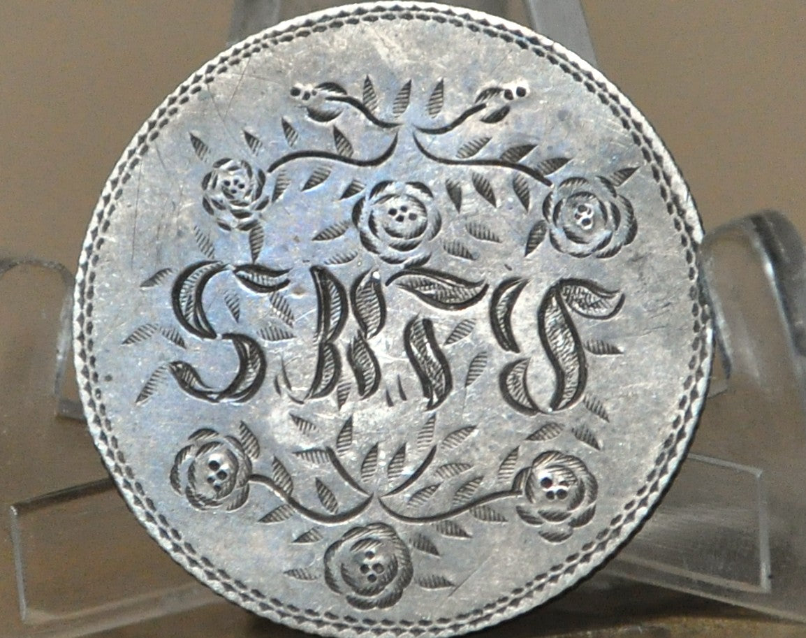 This listing is for the Canadian Quarter Antique Love Token Pin. This stylized, unique Canadian quarter now displays gorgeous craftsmanship featuring initials and a flower design surrounding. This item was previously a Pin/Brooch. Due to time and wear, it has broken off, but it can be repaired. Great Find, with an interesting, unique History!!!