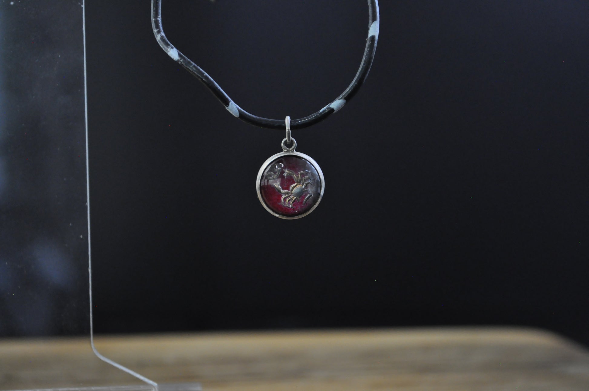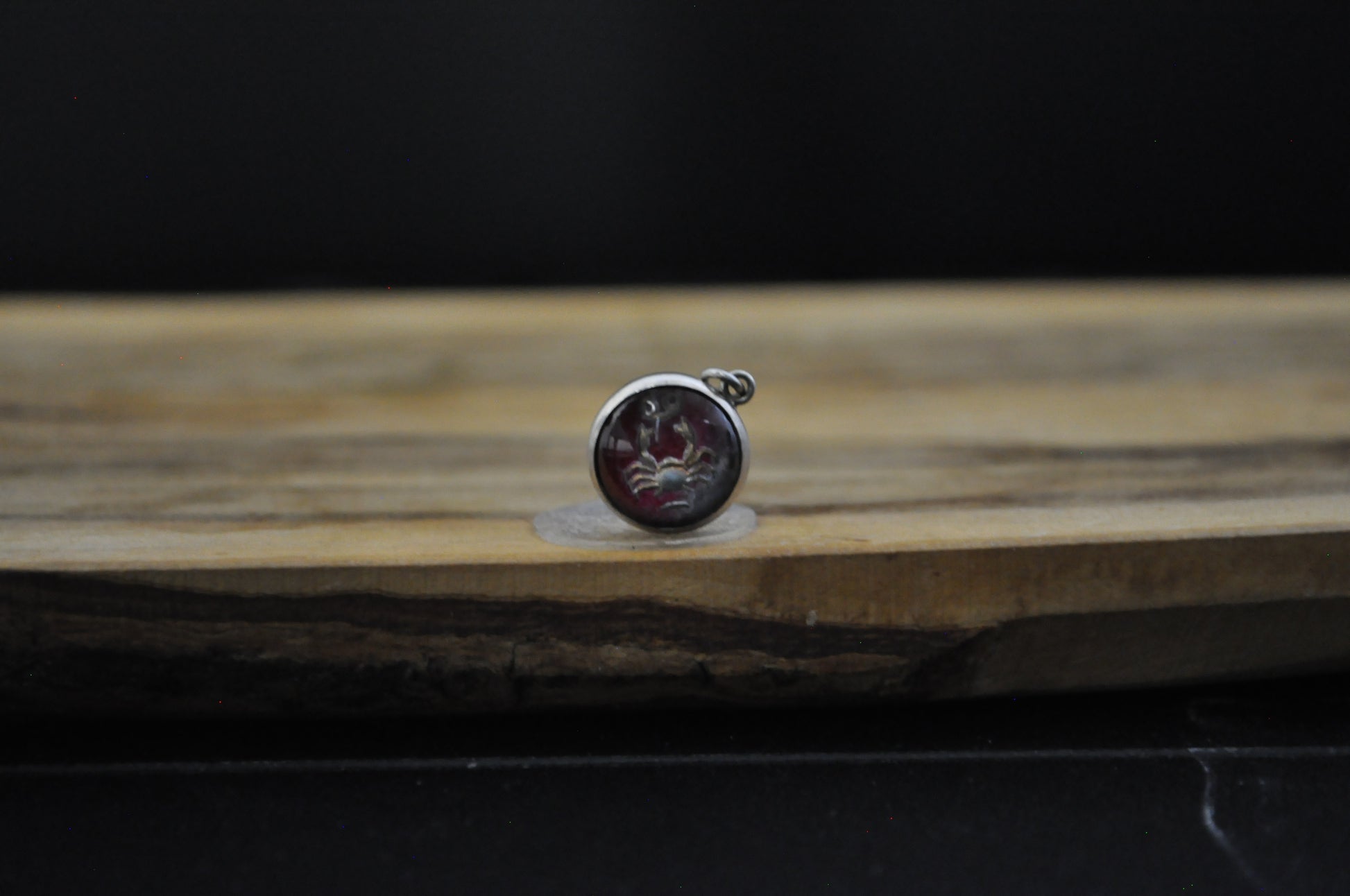 This listing is for the photographed Sterling Silver Lucite Aquarius Pendant. Cool pendant featuring a crab and the Cancer symbol symbol all inscribed in a bronze/gold like tone and encased in Lucite with a blood red background. The back of the pendant features writing saying "Cancer The Crab Domesticity" encased in Lucite with a beige background. The Cancer astrology sign symbolizes that a person may be deeply emotional, nurturing, and highly intuitive as well as may characterize themselves as a "home-body'. A great gift for Cancer's from friends and family.