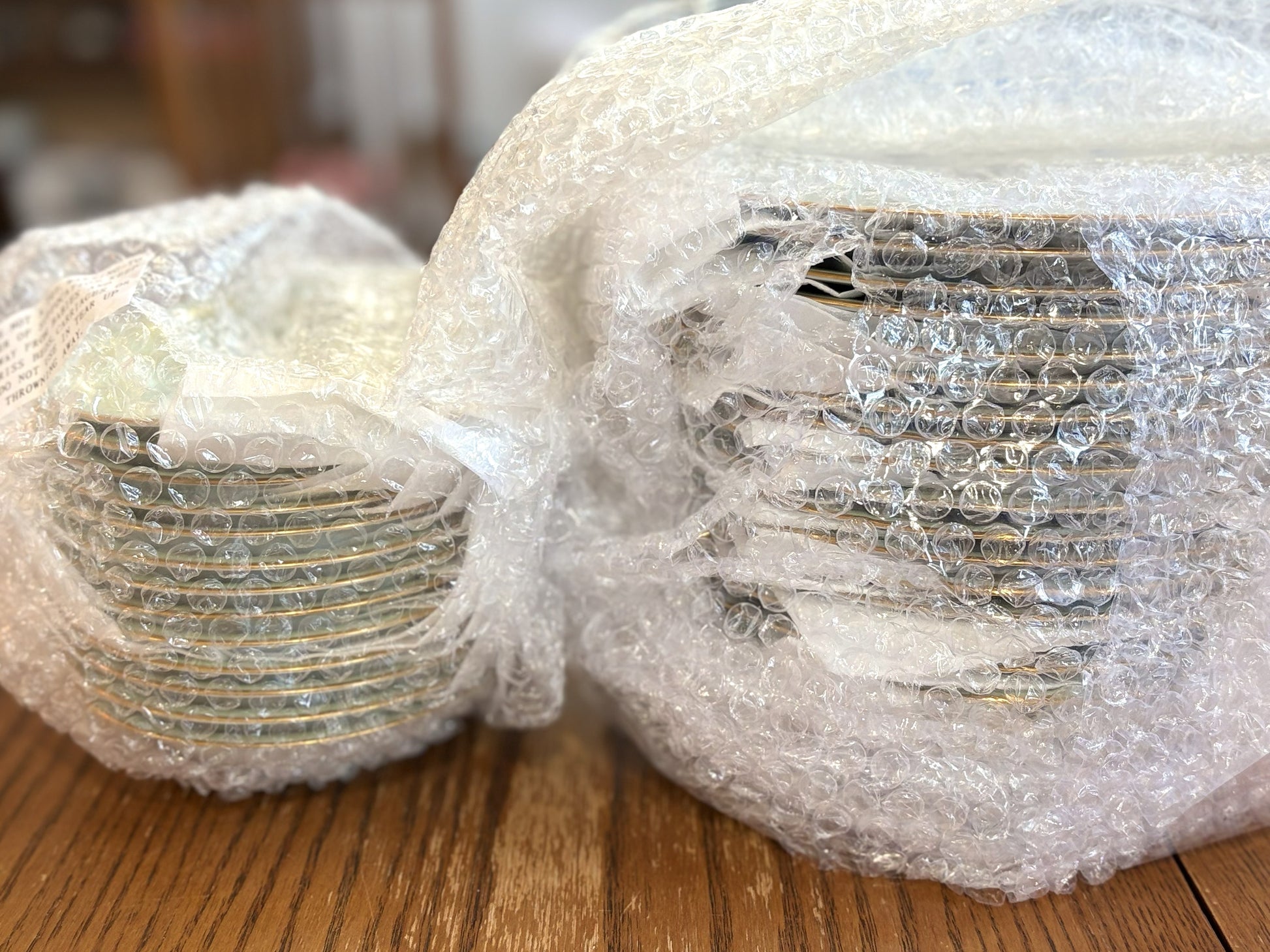 This listing is for the Noritake Japan Fine China 130+ Pc Set: Gold & Green Scroll. Crafted in Japan, the set is characterized by a sophisticated light green band adorned with an intricate gold floral scrollwork and finished with a polished gold rim. This massive service for 20+ includes 40 large dinner plates, 22 tea cups, 30 saucers, a gravy boat with an attached underplate, and a complete creamer and sugar set. Due to the delicate metallic gold accents, these fine porcelain pieces are not microwave safe and should be hand-washed to preserve the finish. Great Find!!!