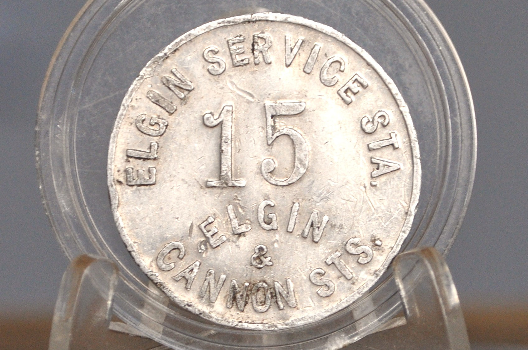 This is an Elgin Service Station "15" token from the establishment located at Elgin & Cannon Streets in Hamilton, Ontario. It served as a trade token, likely used for transactions or services valued at 15 Cents at the station. Interesting Find!!!