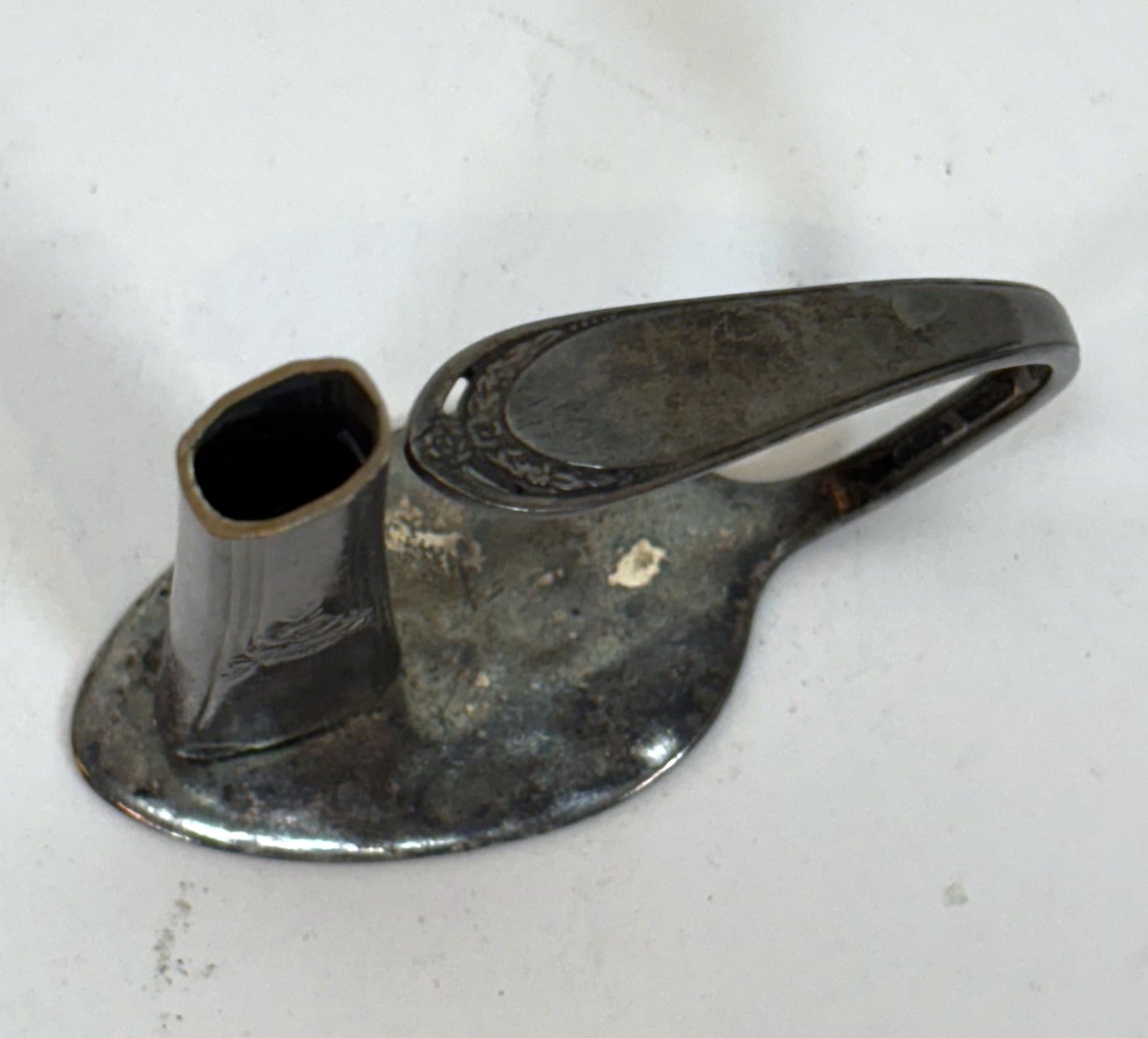 This listing is for the The item is a handcrafted bud vase or candle holder made from repurposed silverware. It features a base crafted from a flattened and bent spoon, with a vertical holder made from the handle of a vintage knife. The silverware has a decorative floral pattern and displays a dark patina, indicating its age. Unique Find!!!