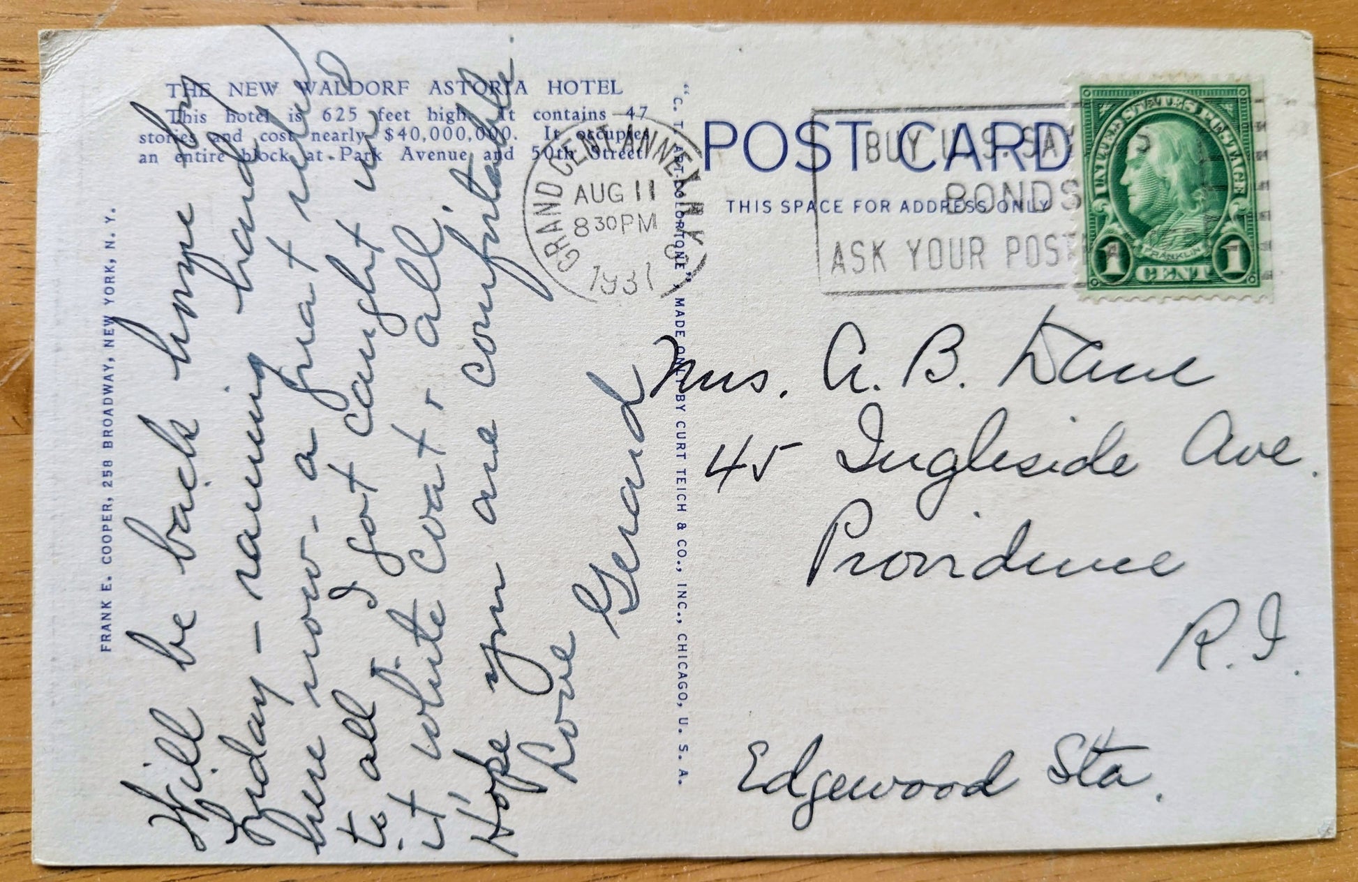 1937 The New Waldorf Astoria Hotel, New York City Linen Postcard - Colorful Lithograph Postcard - Antique New York City NYC Postcard
