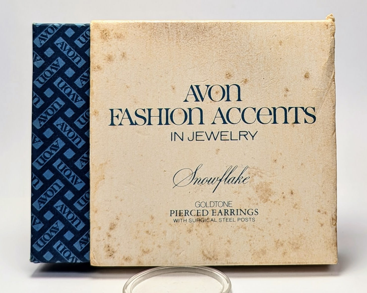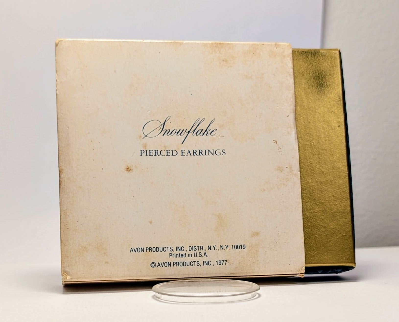 This listing is for the photographed New In Box 1977 Avon Goldtone Flat Snowflakes Pierced Dangle Earrings. Beautiful gold toned pierced earrings that feature a large flat snowflakes. These earrings come inside of their original box, which was copyrighted in 1977. Great vintage earrings, amazing vintage find! Cool New Old Stock (NOS) Avon find!