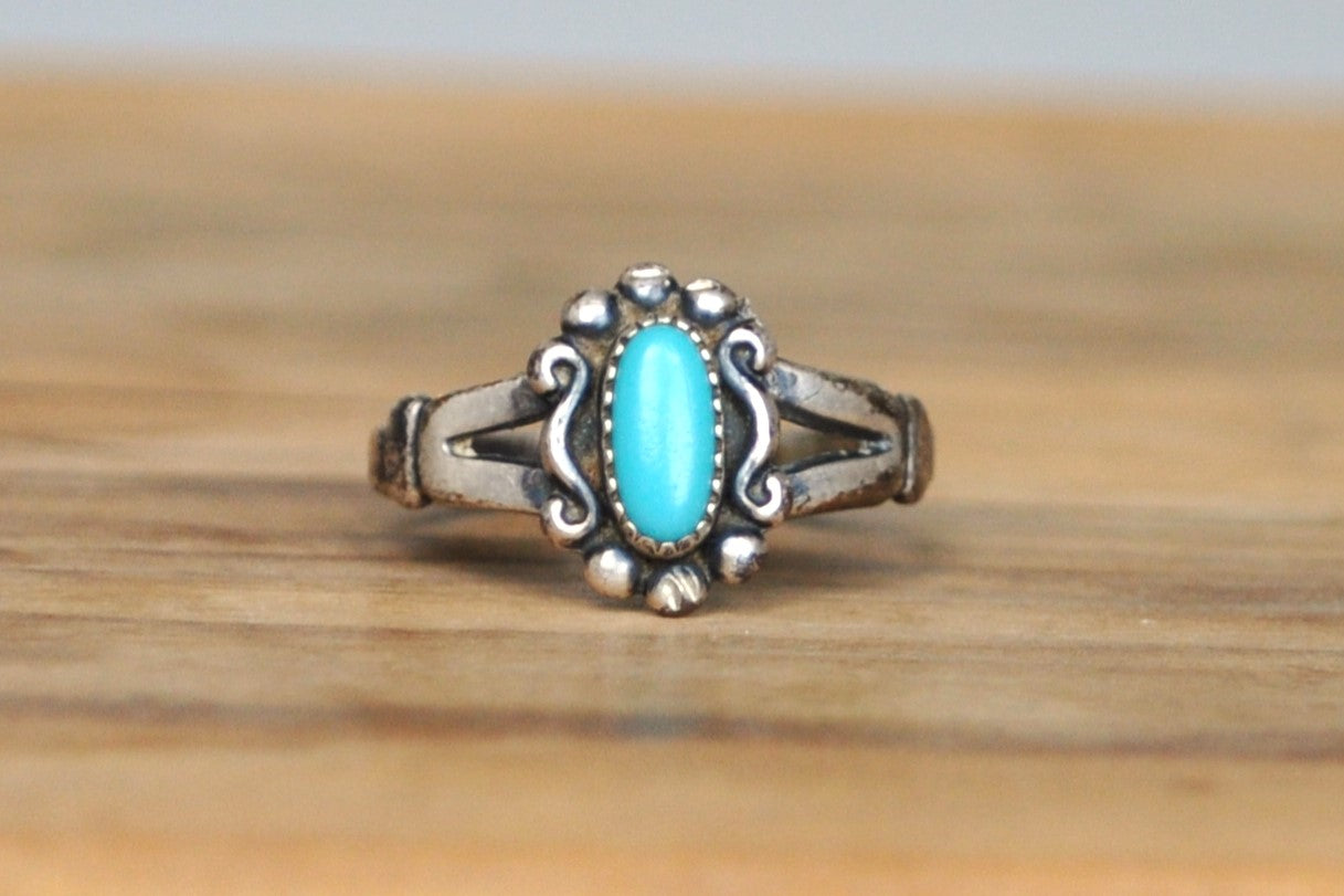 This listing is for the photographed Bell Trading Post Sterling Silver Skinny Oval Turquoise Stone Ring - Size 6. It is stamped with the Bell Trading Post hallmark and "Sterling". Bell Trading Post was established on Route 66 in Albuquerque in 1932 and catered to tourists traveling on the new highway. They copied the Fred Harvey business model of creating machinery to aide their Native American workers in producing jewelry. The Navajo believed turquoise was a sacred stone used for protection from evil, good fortune, and health. The turquoise blue is very special in Navajo culture resembling the sky and water.