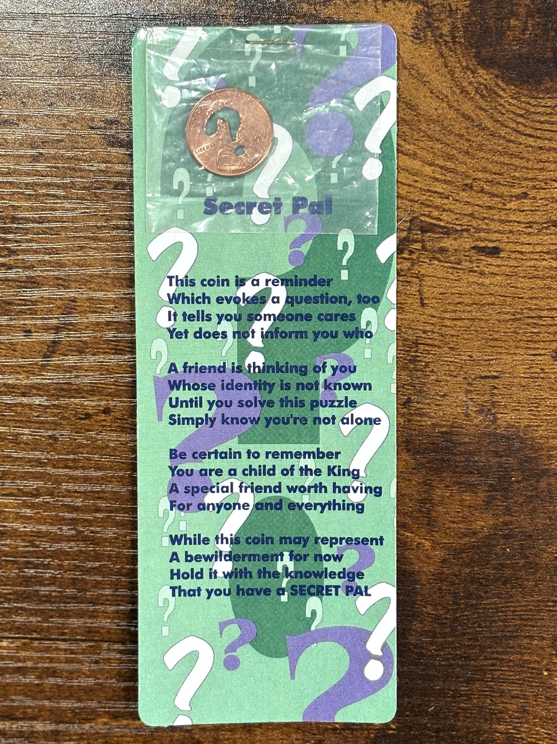 This listing is for the Secret-Pal Genuine Pocket Cent-I-Ment. This modified penny stamped with a question mark is a reminder to evoke a question. A unique Sentiment gift for a friend or loved one, gift them a secret pal!