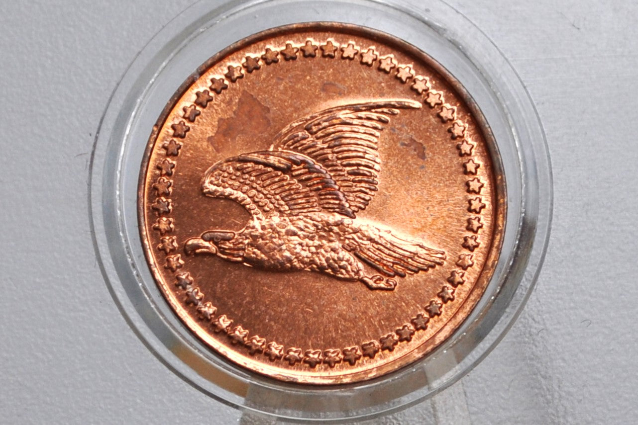 This listing is for a 1925-1968 Robert Francis Kennedy Commemorative Token. The token features a profile of Robert Kennedy on the obverse, with his birth and death dates, and his full name elegantly displayed in an arc along the lower rim. The reverse showcases a majestic flying eagle surrounded by fifty stars along the rim, making this a meaningful memorial piece.