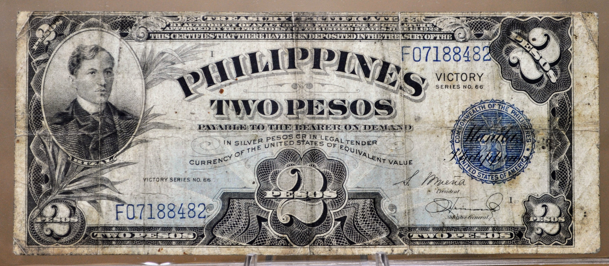 This listing is for the photographed 1944 Philippines 2 Pesos Victory Treasury Certificate. World War II Victory Series, issued by Commonwealth of the Philippines while under U.S. occupation. Great piece of history. Choice of Grade/Condition. P# 95a (Pick Number 95a).