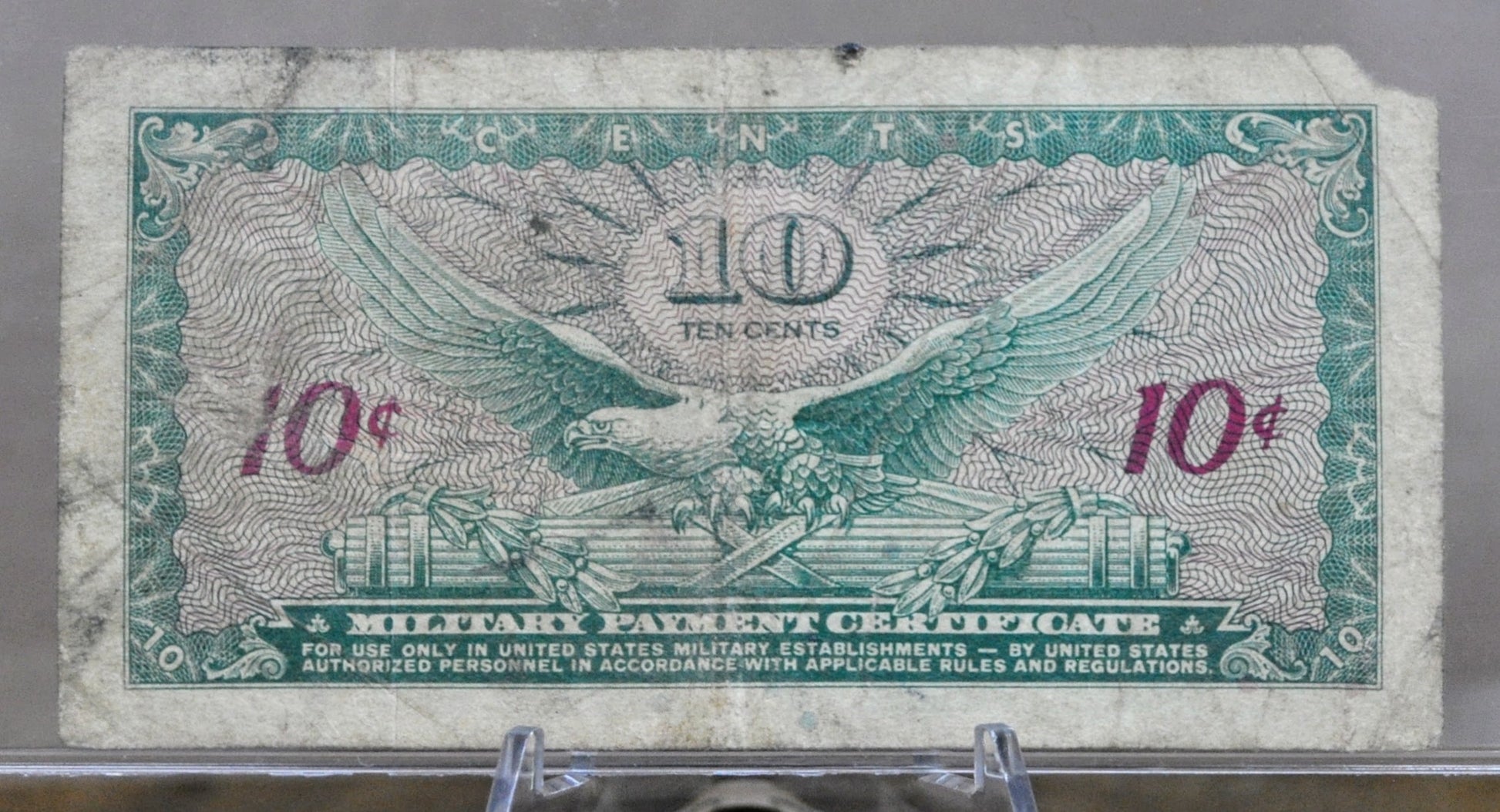This listing is for the photographed 1965 U.S. Military 10 Cent Payment Certificate. Series 641. These notes were used by soldiers during the Vietnam War, primarily in the U.S. overseas military bases. Fine (F) grade/condition, folds and other signs of circulation, including a tear in the upper left corner, as pictured. Beautiful artwork and design. Fractional MPCs are a bit rarer, and all MPCs have grown in popularity among collectors in recent years. Rarer series. P#M58a (Pick number M58a).