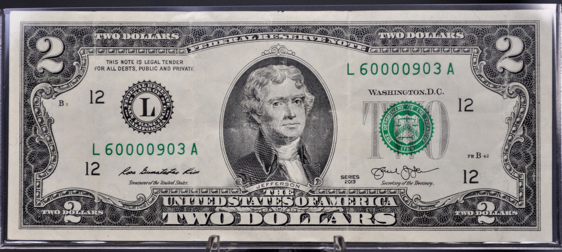 This listing is for the photographed 2013 San Francisco 2 Dollar Federal Reserve Fancy Serial Number Note. Issued at the Federal Reserve Bank of San Francisco, California, "L" seal issue. Note's serial number includes a solid quad repeater with four zeros in a row, 60000903. Extremely Fine (XF) Grade / Condition. Excellent note for any collection! Fr#1940-L (Friedberg Number 1940-L).