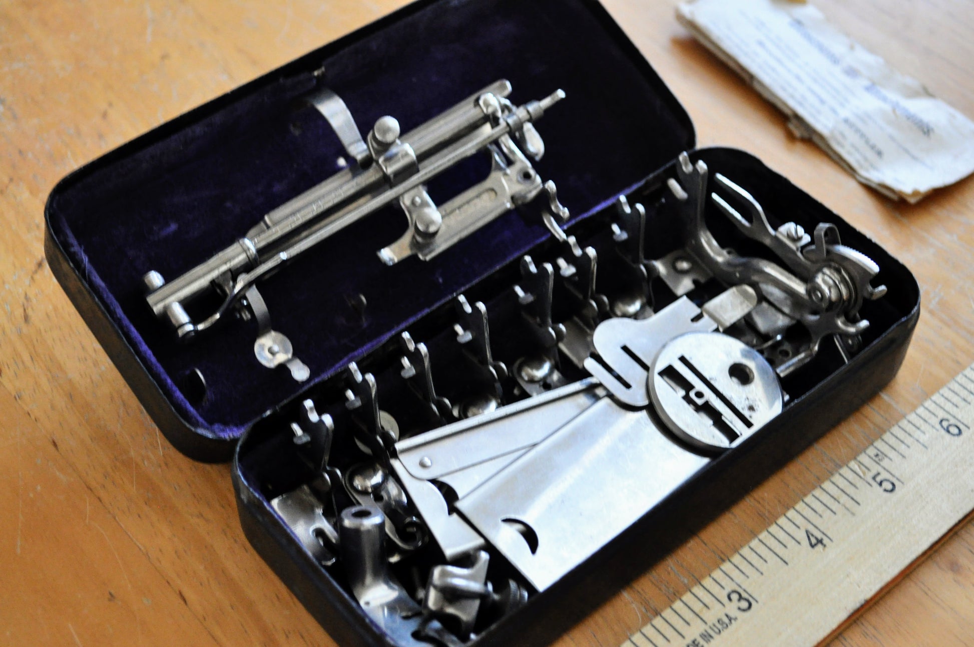 Antique 1890s Johnston's Sewing Machine Accessories in Box - With Instructions - Victorian Sewing Machine Hemmer, Tuck Marker, Ruffler Parts