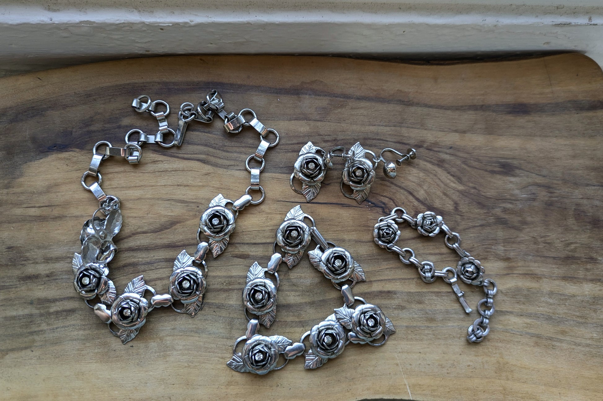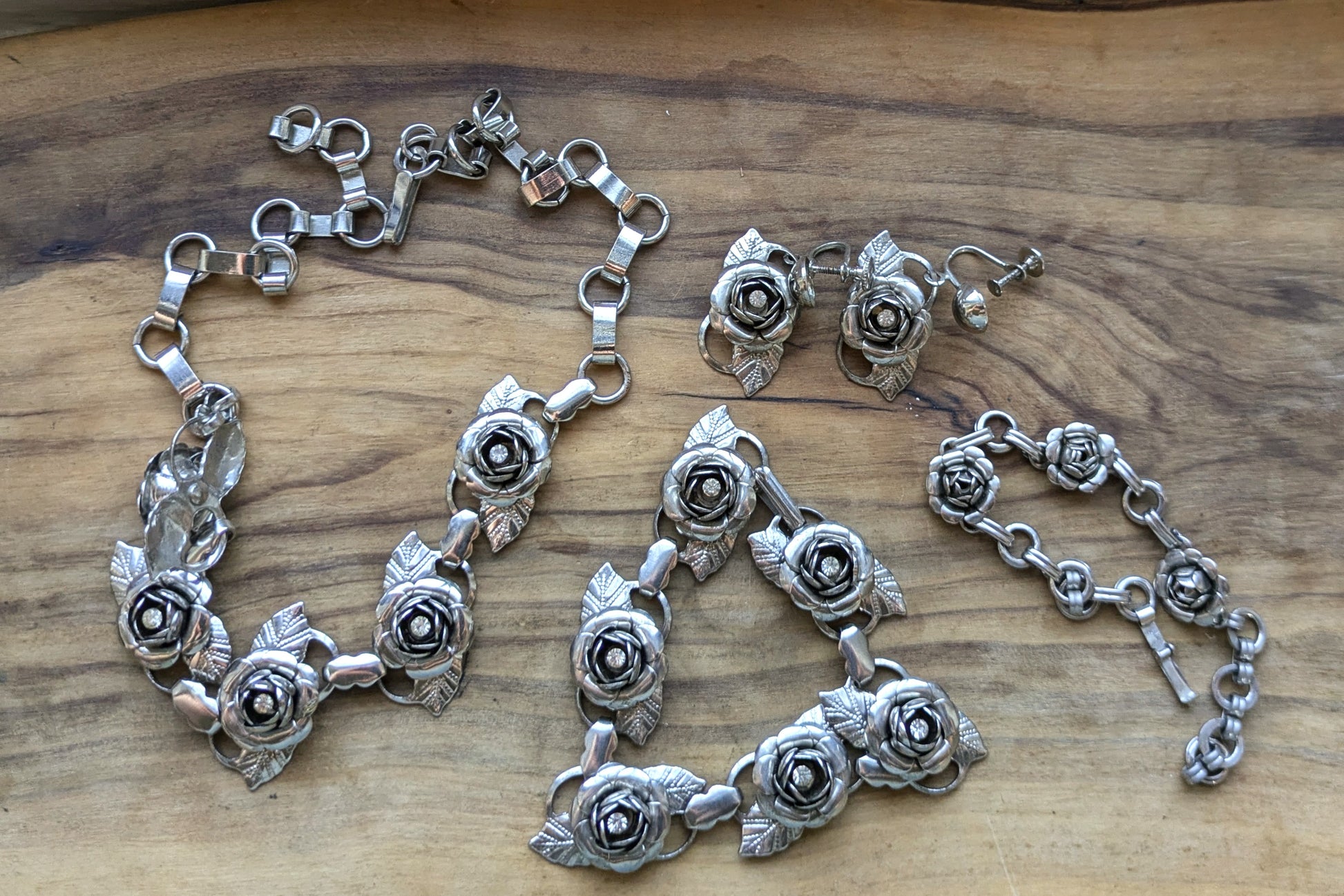 This listing is for the photographed Set of Silvertone Rose Rhinestone Jewelry. The rose set includes a long necklace of 16 inches, a bracelet of 7 inches, another bracelet/anklet of 7 inches, and silver tone rose earrings.
