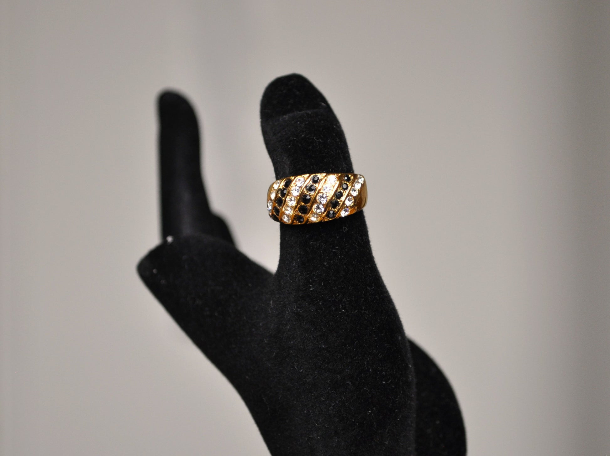 This is a Shining 18K Gold Electroplated Black & Clear Crystals Ring - Size 6 as photographed. Beautiful 18K gold electroplated ring engraved on the bottom inside portion of the ring is "18KT GEPAD". The top inside of the ring contains raised bumps in a oval dip going into the ring.