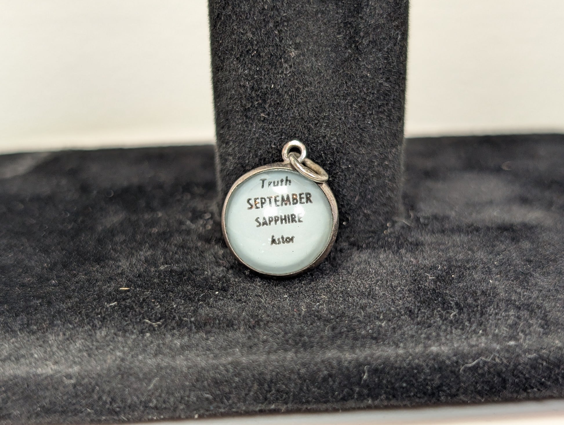 This listing is for the photographed Sterling Silver September Sapphire Pendant. Featured on the small sterling silver pendant is a large blue sapphire on one side, the birthstone of September. On the other side words associated with September and sapphire appears encased in Lucite: "Truth September Sapphire Astor." The Astor is the flower of September. The Blue Sapphire Gemstone is used to signify trust, honesty, and loyalty. Blue Sapphire is also known to have uses for helping with calming the mind and improving cognitive skills as well as headache relief and migraines.