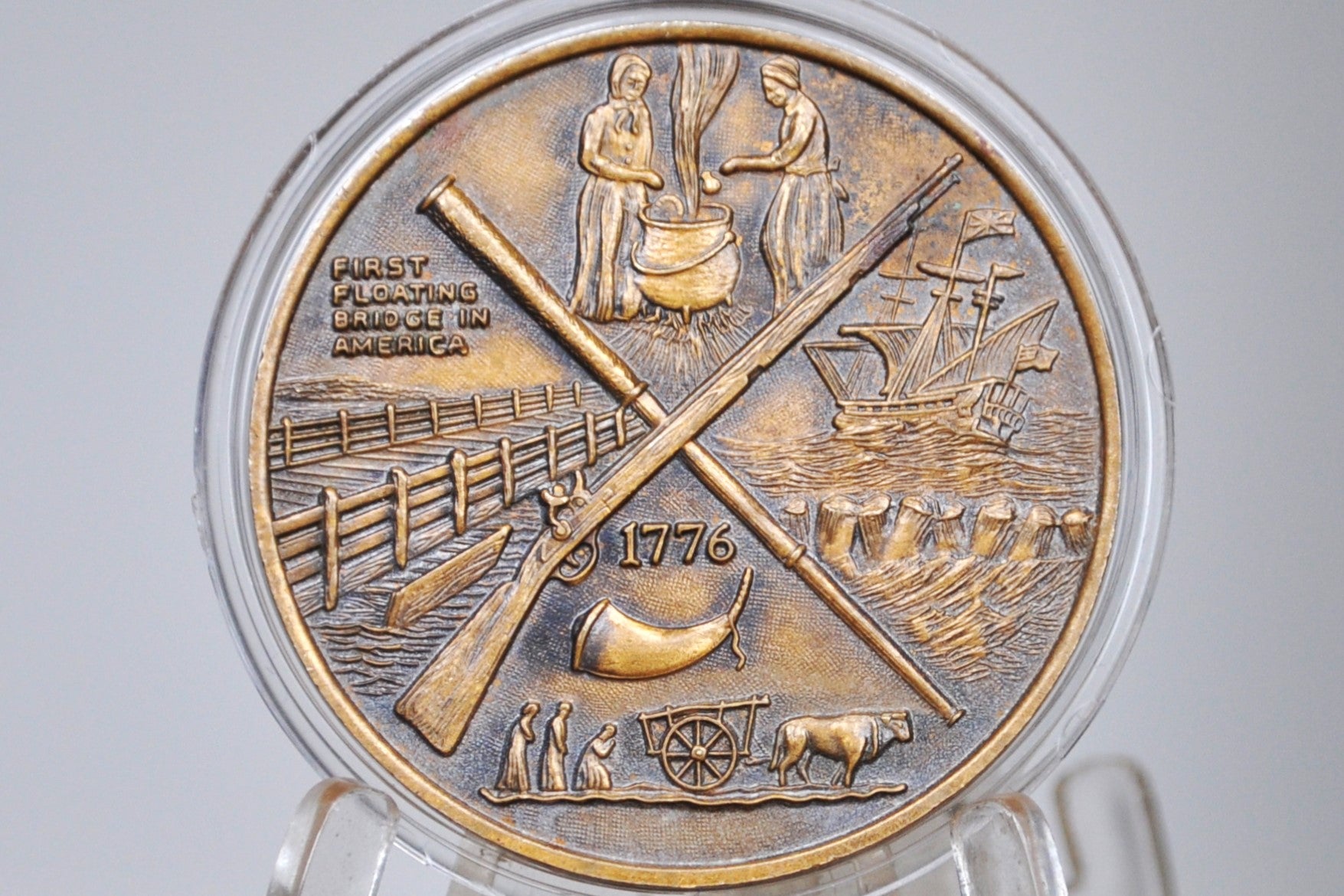 This listing is for the First Floating Bridge in America, 1638, Salisbury, Massachusetts. The Obverse of this medallion depicts a small shore with a tree to the left and the right a small canoe docking with 2 passengers. above them it says Salisbury, Massachusetts 1638. The Reverse of this token depicts early American life, including colonists, a ship, a fence, and a rifle. Interesting and unique find!