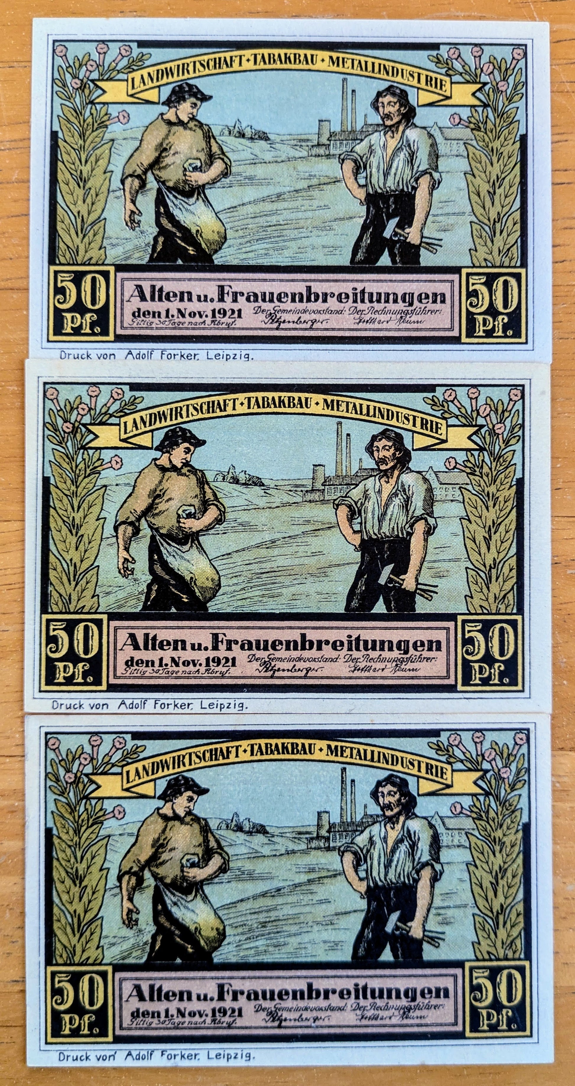 1921 Alten und Frauenbreitungen Germany 50 Pfennig Notgeld Set - Sights Series Set of 3 - 1921 German Emergency Currency Fifty Pfennig Notes
