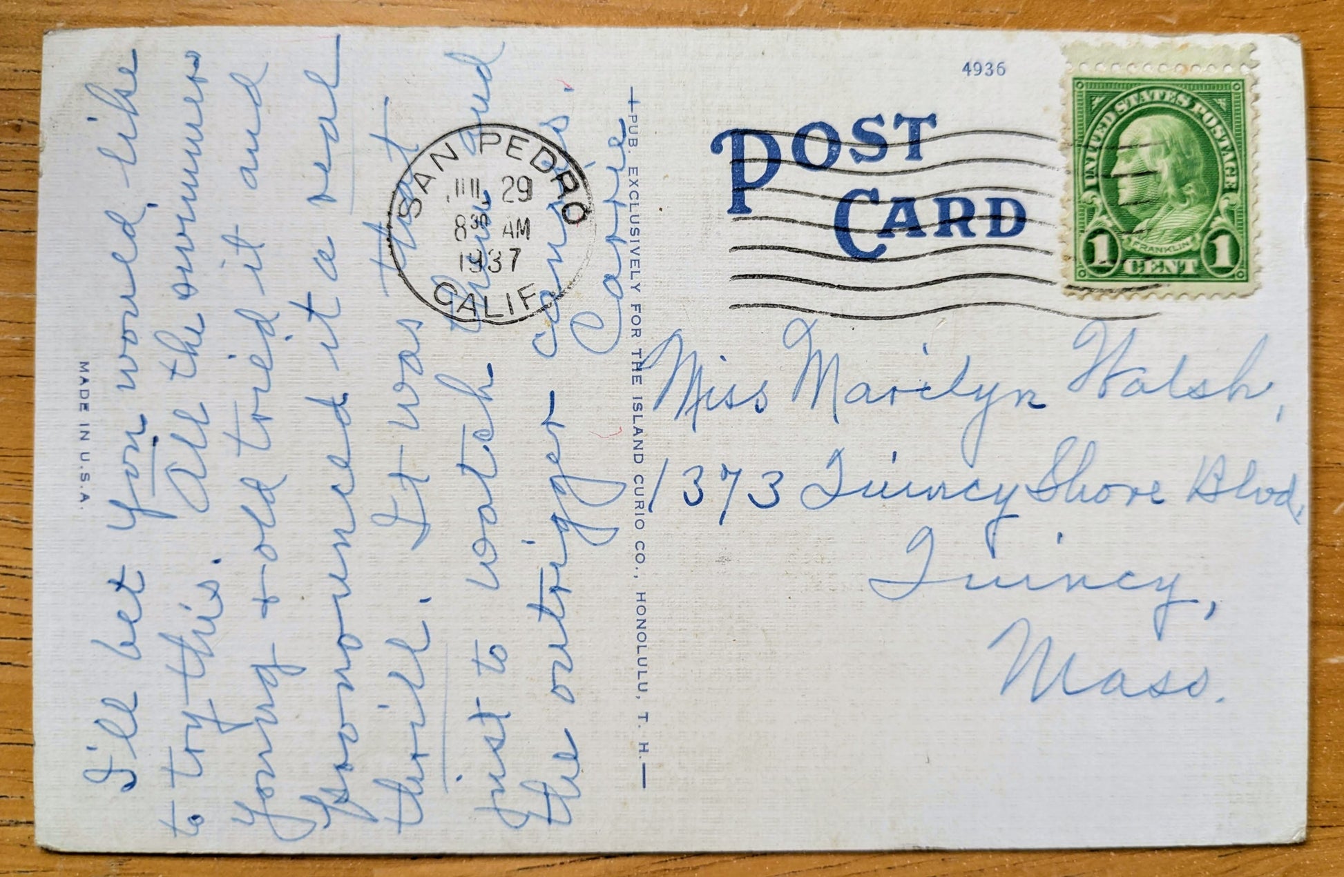 This listing features an Antique 1937 Colorful Surf Riding at Waikiki Beach Honolulu Hawaii Linen Postcard. Interesting textured front, known as a 'linen' postcard. This postcard was sent and postmarked with the date 1937. A chromo/colored lithograph view of surfers surfing on Waikiki Beach in Honolulu, Hawaii. Perfect addition to any collection! Antique souvenir with a beautiful scene!