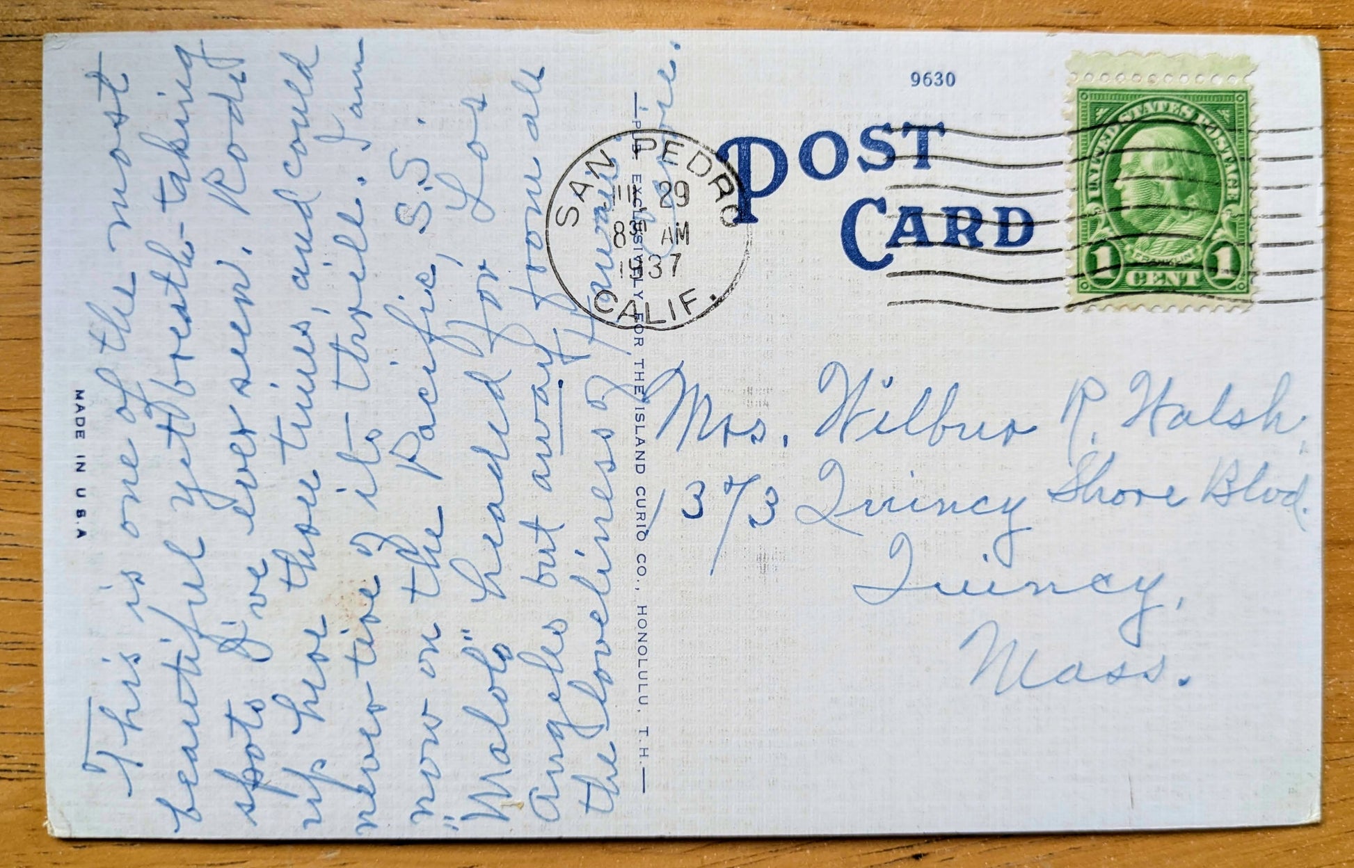 This listing features an Antique 1937 Colorful Nuuanu Pali Honolulu Hawaii Linen Postcard. Interesting textured front, known as a 'linen' postcard. This postcard was sent and postmarked with the date 1937. A chromo/colored lithograph view of a winding road around the Nuuanu Pali Cliff in Honolulu, Hawaii. Perfect addition to any collection! Antique souvenir with a beautiful scene!