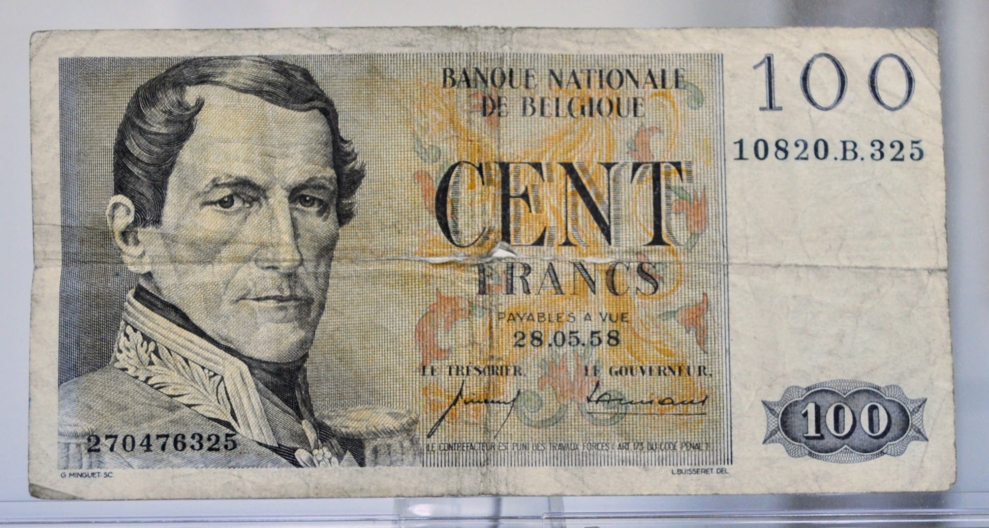 This listing is for the photographed 1958 National Bank of Belgium 100 Franc Banknote. This note was issued on May 28th, 1958 (28.05.58). Signed by Ansiaux and Vincent. The obverse of this note depicts a portrait of Leopold I on the left end. Reverse shows a portrait of Fr. Orban on the right end with a street view in the background. Fine (F) grade/condition, some visible folds and signs of circulation, as pictured. Excellent find from an interesting era of world history! P#129c (Pick Number 129c).