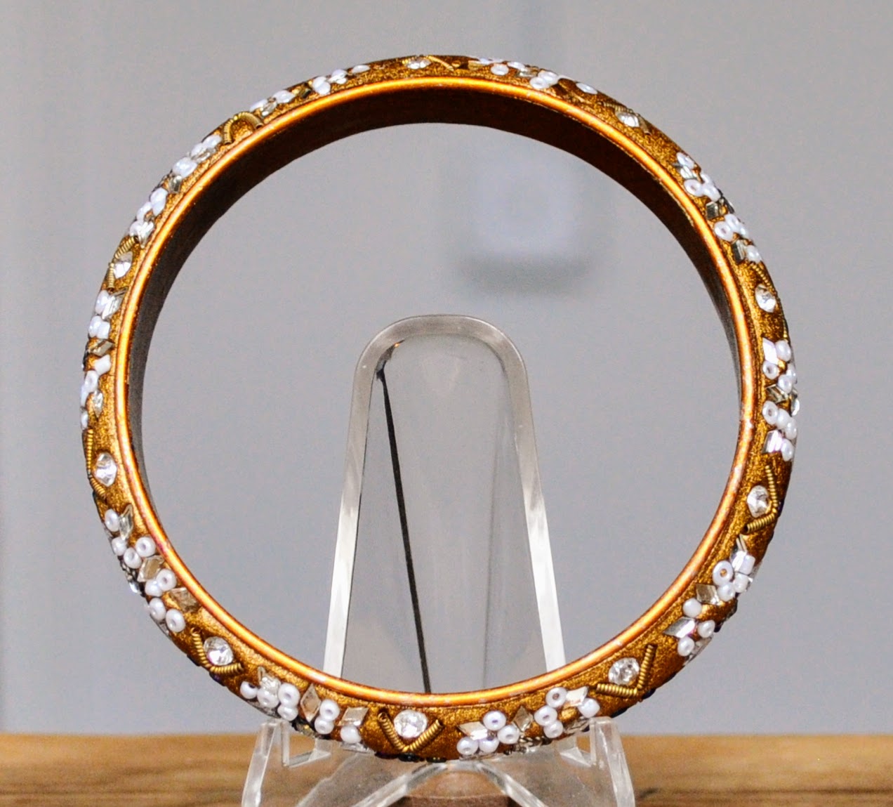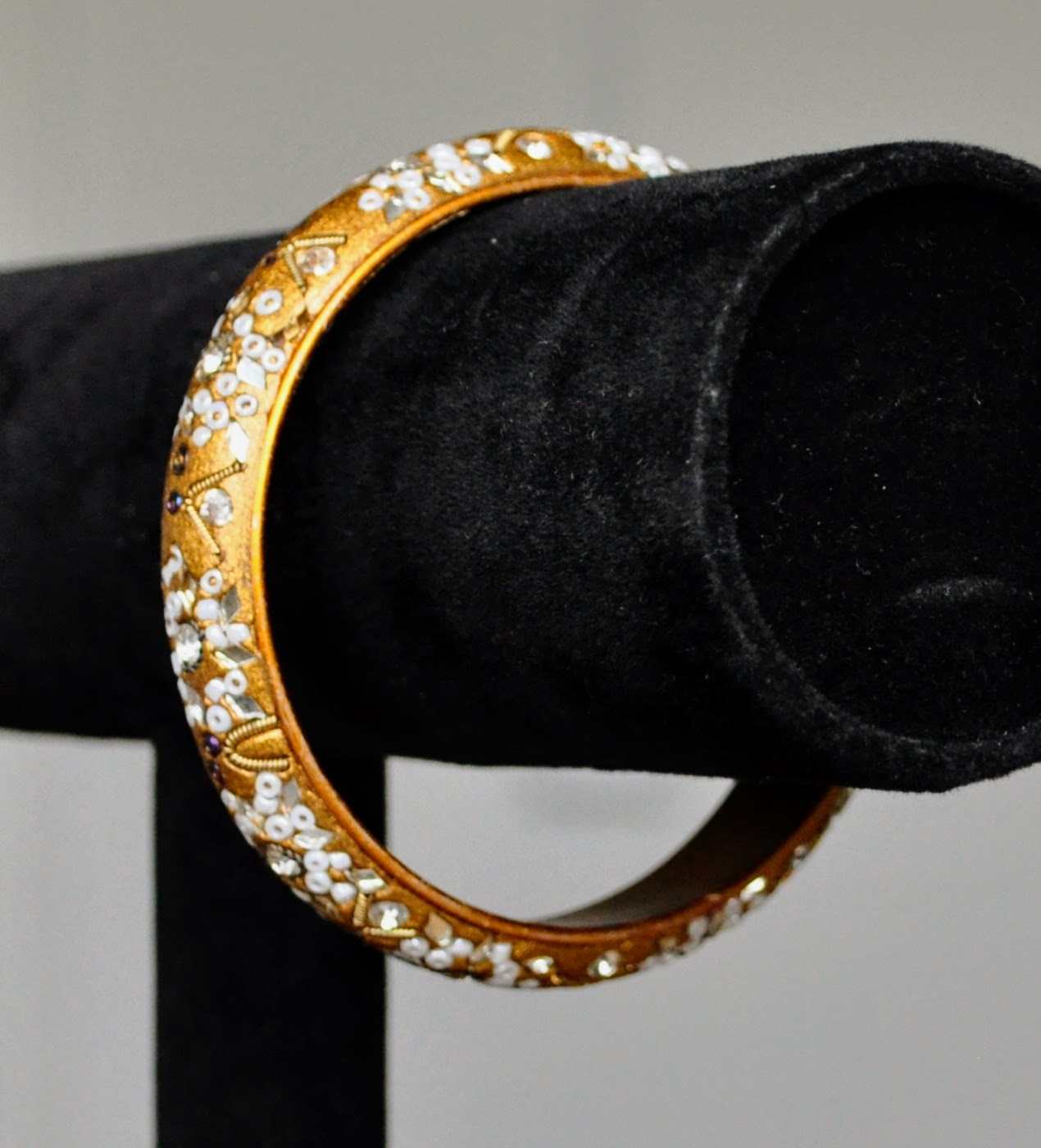 This listing is for the photographed Vintage Gold Tone Beaded and Mirrored Mosiac Bollywood Bangle Cuff. Bracelets inside width measures 2.5 inches. The bangle measures approximately 1/2 inch thick. The bracelet is gold-toned and has a mosiac design made of beads and small mirror pieces to make a stunning and unique patterned design! This style of mosaic inlayed bangles was popularized in India with the popularization of Bollywood. Unique beautiful piece with lots of character, perfect addition to any collection!