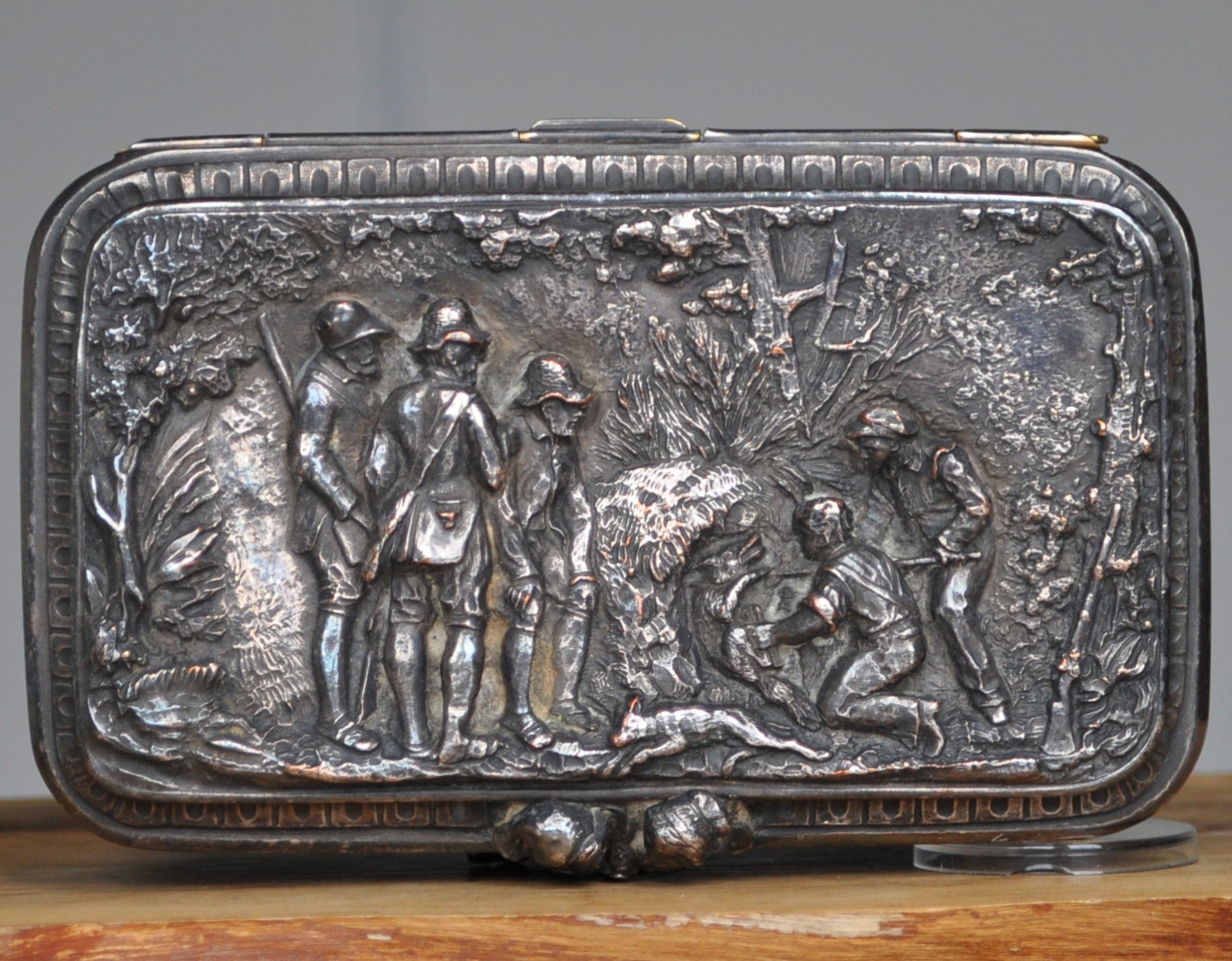 This listing is for the photographed Antique Silverplated Boar Hunting Box. This is an antique silver plated jewelry or trinket box with a hunting scene on its sides and lid. It is likely from the late 19th century or early 20th century, based on its style and details. The box features a detailed depiction of dogs hunting a boar, surrounded by trees and foliage. The box has a hinged lid and sits on small feet. Inside the box is a soft purple mesh comfort your jewelry. A small wooden stick is located within the box as well as a small pin of a gold tone bird.