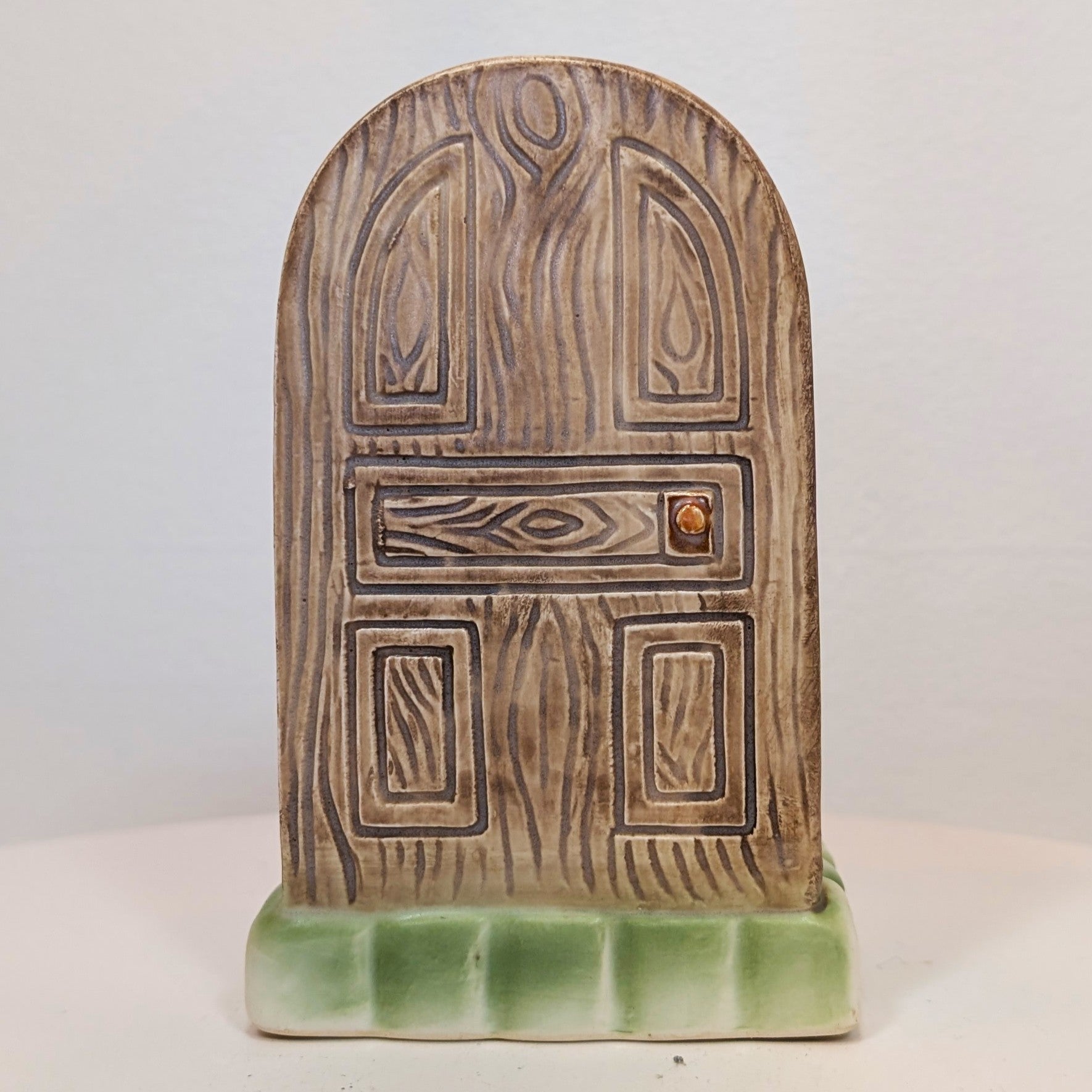 This piece depicts a mouse in a yellow dress, knocking on her first customer's door.
