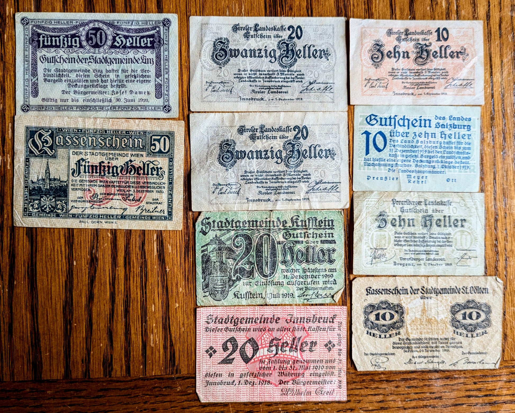 Lot of 10 WWI Austria Heller Notgeld Emergency Notes - 10, 20, and 50 Heller - WWI Austrian Notgeld - 1920 Austria Heller Municipal Notes