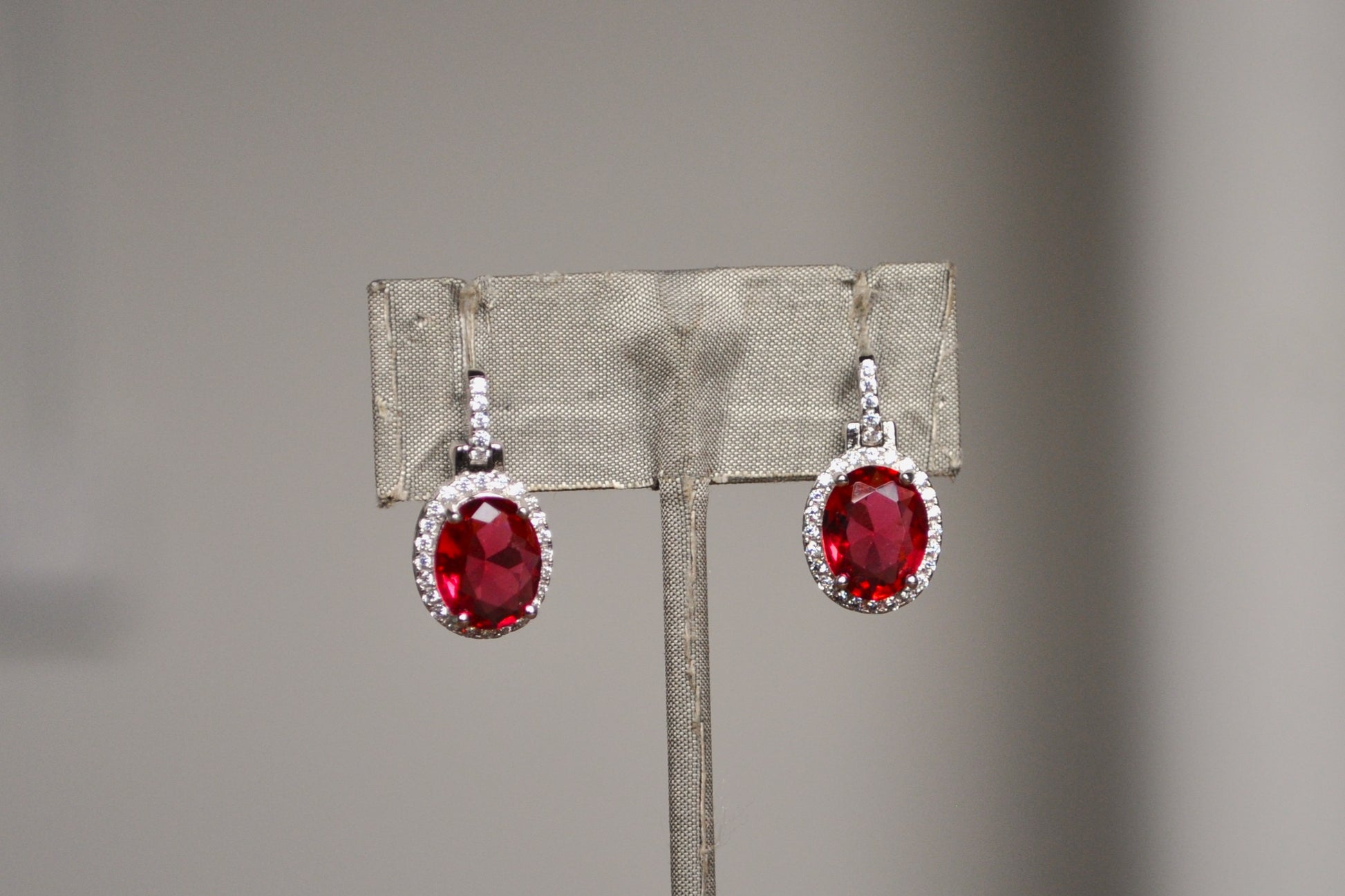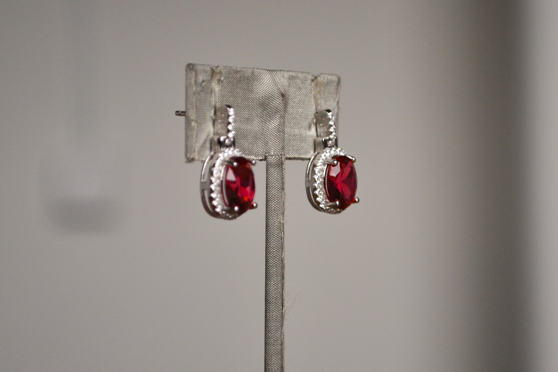 This listing is for the photographed Stunning Sterling Silver Cubic Zirconia Ruby Earrings. Absolutely stunning ruby earrings made of sterling silver. Cubic zirconia surrounds the rubies in the center of the earrings. The rich red color of the ruby has been believed to have a link with courage, love, and the essence of life. It has also long been linked to war and warding off evil during war.