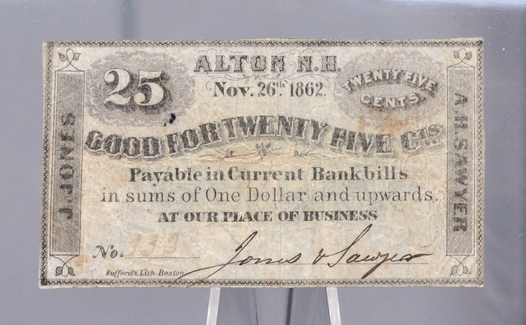 1862 Alton NH Jones and Sawyer 25 Cents Merchant Scrip - Nov 26th, 1862 - Civil War Era New Hampshire Obsolete Twenty-Five Cent Note
