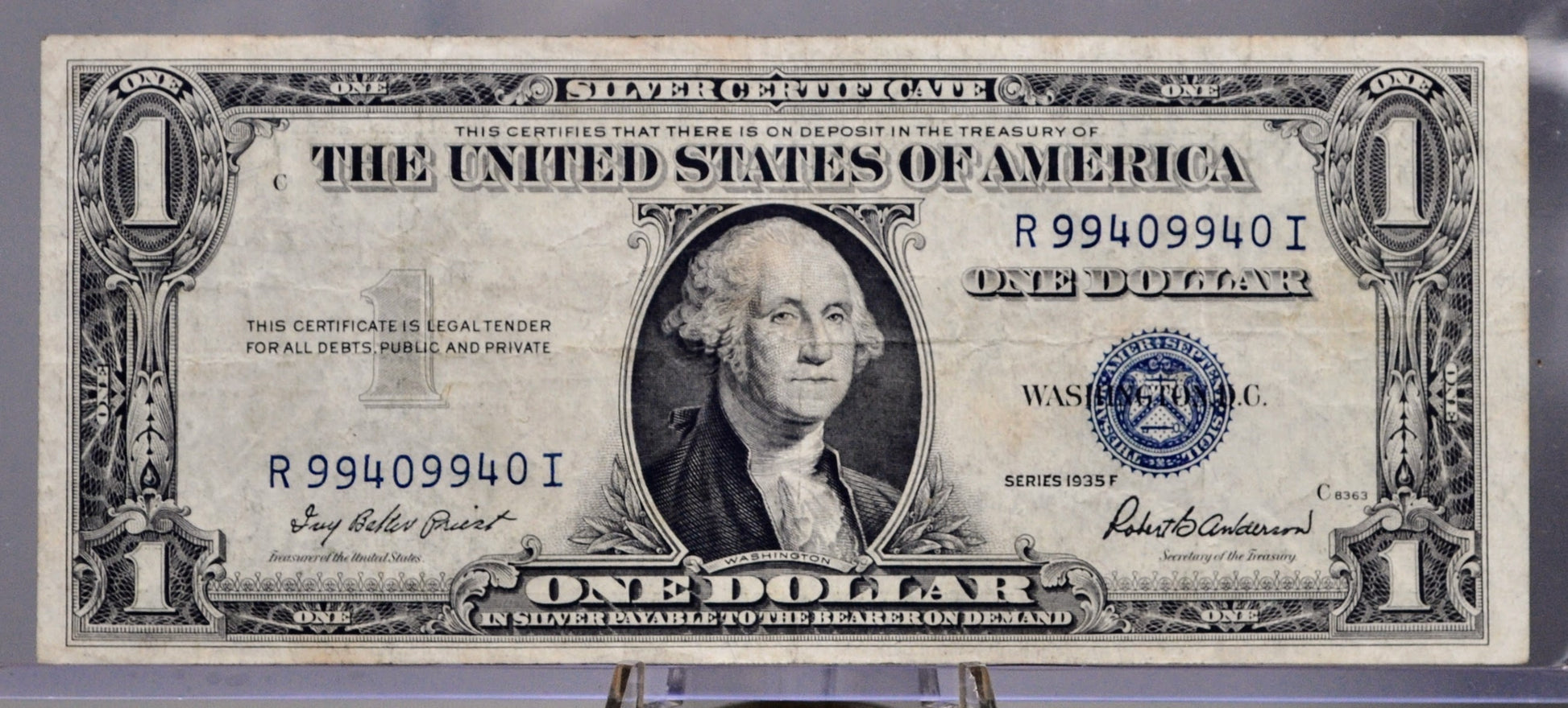 This listing is for the photographed 1935 F Silver Certificate 1 Dollar Blue Seal Fancy Radar Serial Number Note. This note has a fancy radar serial number, as its serial number starts and ends with the same set of numbers, "R99409940I". Choice Very Fine (VF+) grade/condition, minor folds and signs of circulation, as pictured. Great novelty item! Excellent addition to any collection! Fr#1615 (Friedburg Number 1615).