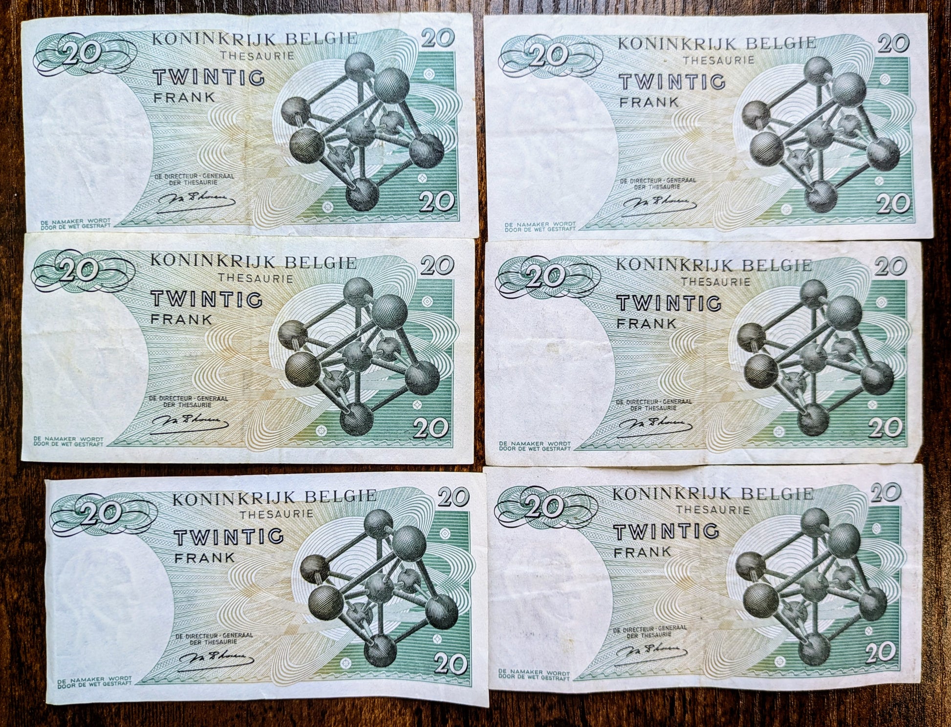 This listing is for the photographed 1964 Belgium Treasury 20 Franc Notes, Lot of 6. These notes were issued on June 15th, 1964 (15.06.64). All notes in the lot are signed by Marcel D'Haeze. The obverse of this note shows a portrait of King Baudouin I on the left end, and the Belgian coat of arms at the right. The reverse of these notes depicts the Atomium, a famous sculpture at the center of Brussels, the capital of Belgium. Notes are in Very Fine (VF) condition with some visible folds and tears from age and circulation. P#138 (Pick Number 138).