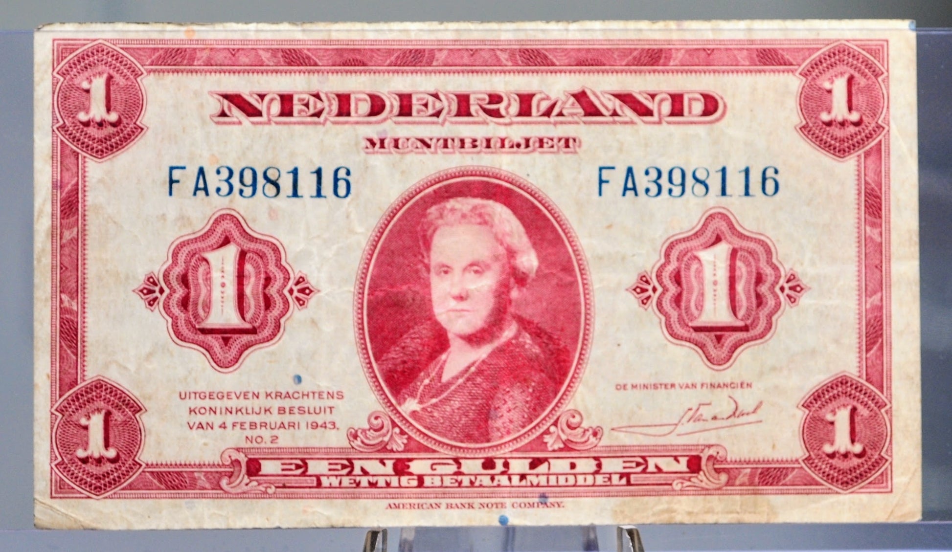 1943 Netherlands 1 Gulden Banknote - Rarer Left Facing Portrait - Muntbiljet Issue - WWII Era Netherlands One Gulden Note 1943 - P#64