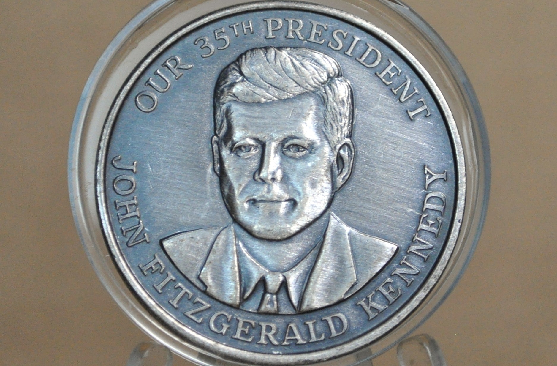 This listing is for the John F Kennedy 35th President Commemorative Medallion. This honors JFK, the 35th President of the United States, who served from 1961 to 1963. The obverse features a front-facing portrait of John Fitzgerald Kennedy and the reverse has his famous quote from his inaugural address. Great Find!!